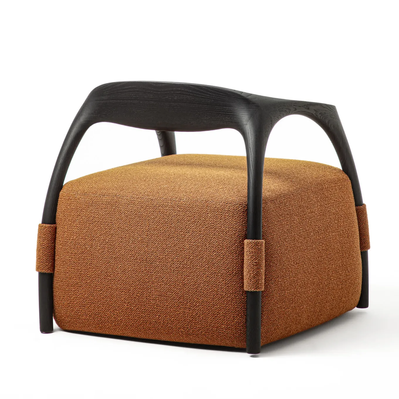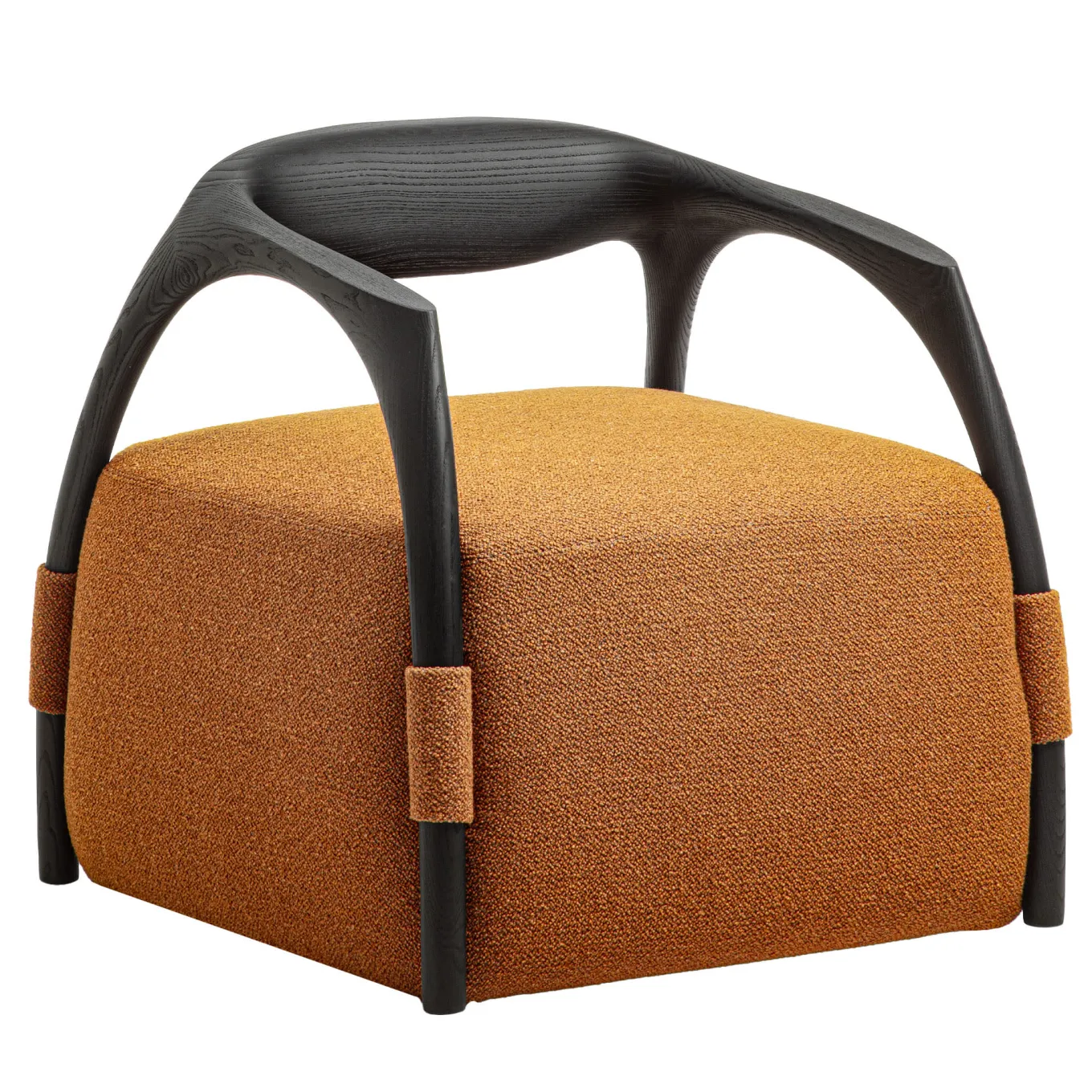 Elegantly crafted from robust Black Ash wood and featuring a luxurious seat adorned in vibrant dark orange fabric, this distinguished armchair marries iconic design with meticulous craftsmanship. Its slender armrests and the open space beneath impart a sense of lightness and sophistication, elevating its timeless allure. With customizable wood finishes and upholstery in fabric or leather, this piece embodies versatility and sophistication, complementing any decor or personal style.