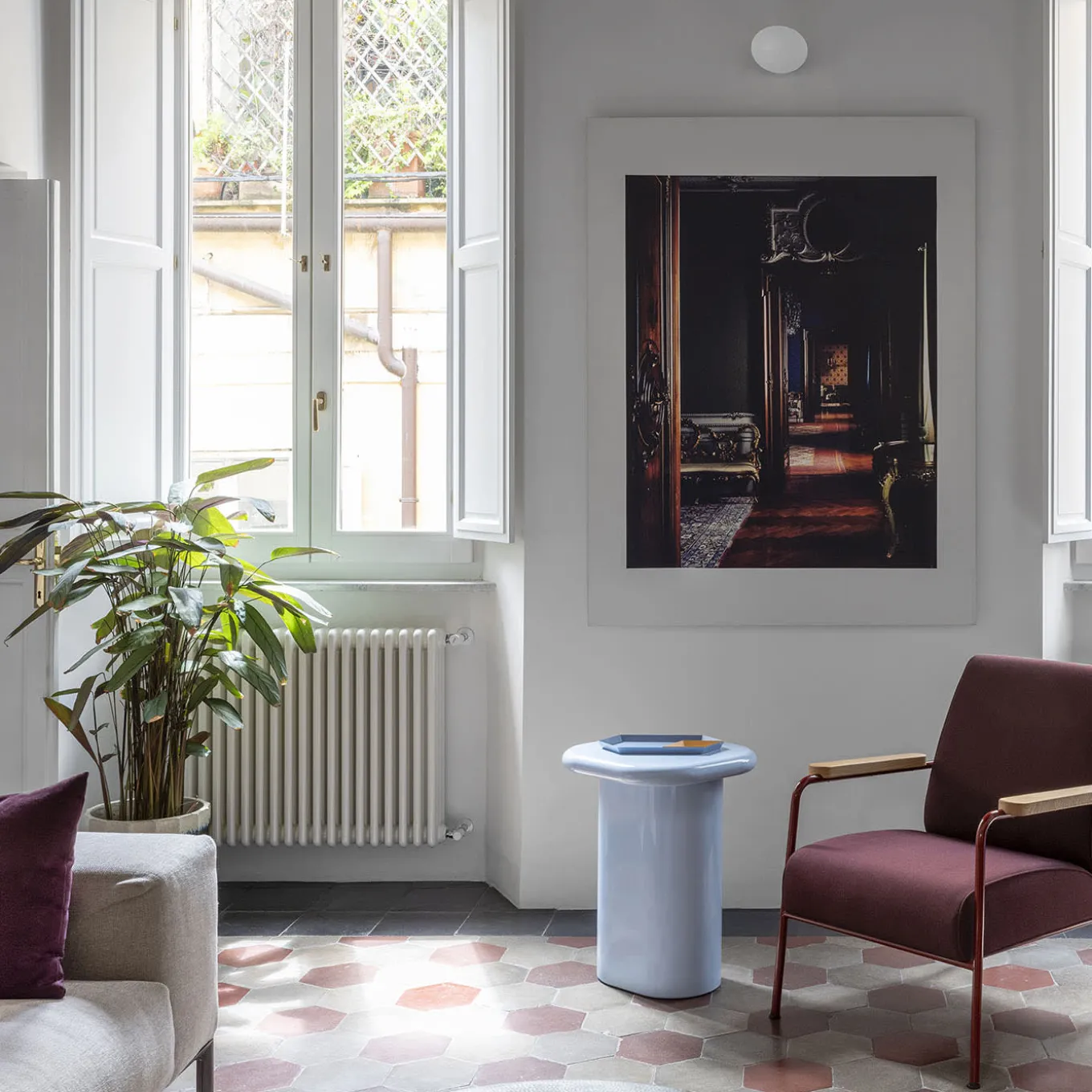 Discover timeless elegance with the Chiodino light blue side table. This striking piece features a high-gloss MDF structure, encapsulating a blend of modern design and vintage inspiration. Its rounded forms and soft curves are reminiscent of 1960s aesthetics, evoking a sense of nostalgia and whimsical charm. Whether placed in a cozy nook or the center of a room, it offers versatile functionality while serving as an eye-catching centerpiece. The design reflects both stability and playfulness, making it a delightful addition to any contemporary home.