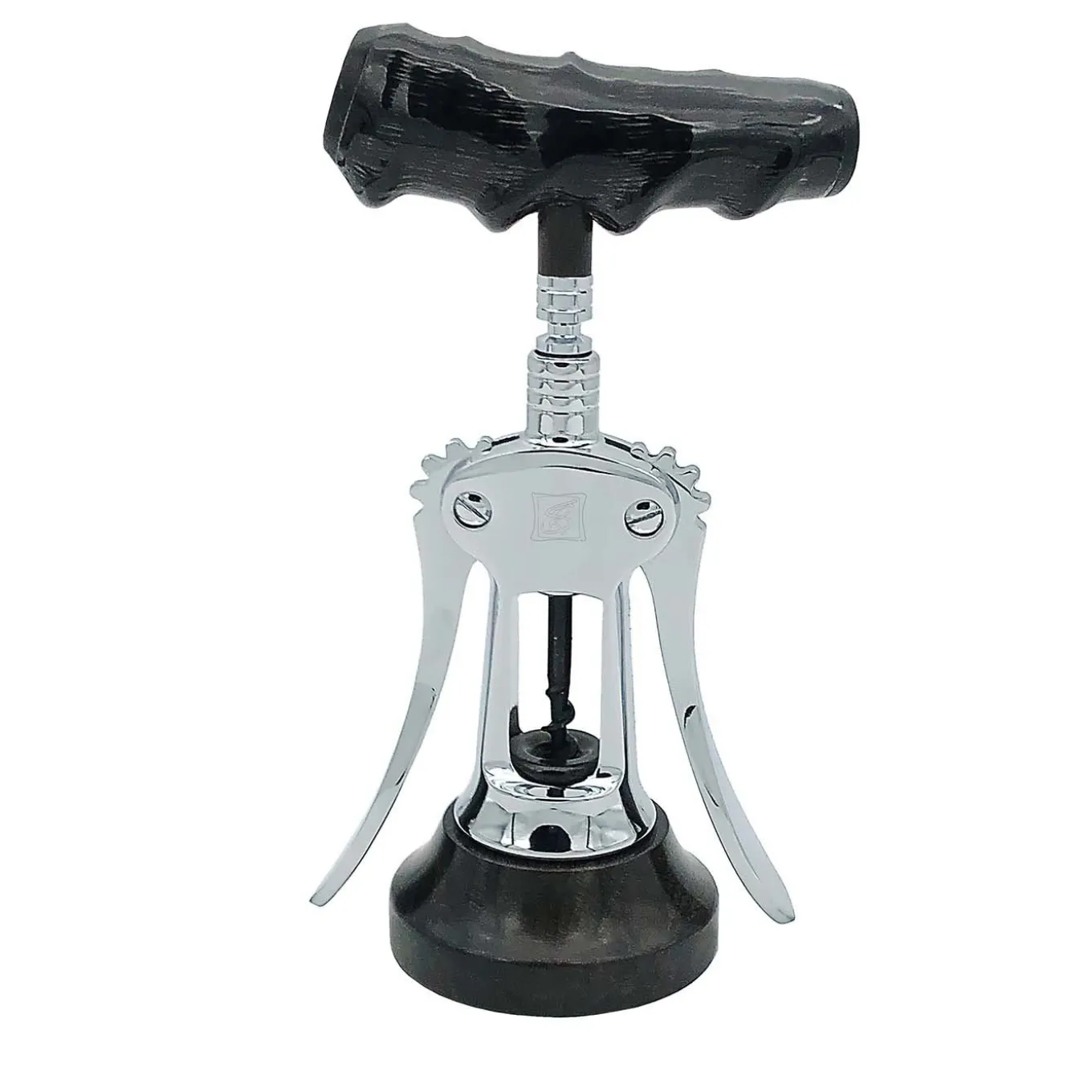 A timeless accessory in a bar cabinet and a well-received gift for wine connoisseurs, this brass winged corkscrew boasts a base of African ebony wood, whose dense black and finely-textured grains are complemented by a polished chrome finish. The genuine impala horn handle adds valuable and ornamental detail to this exclusive corkscrew.