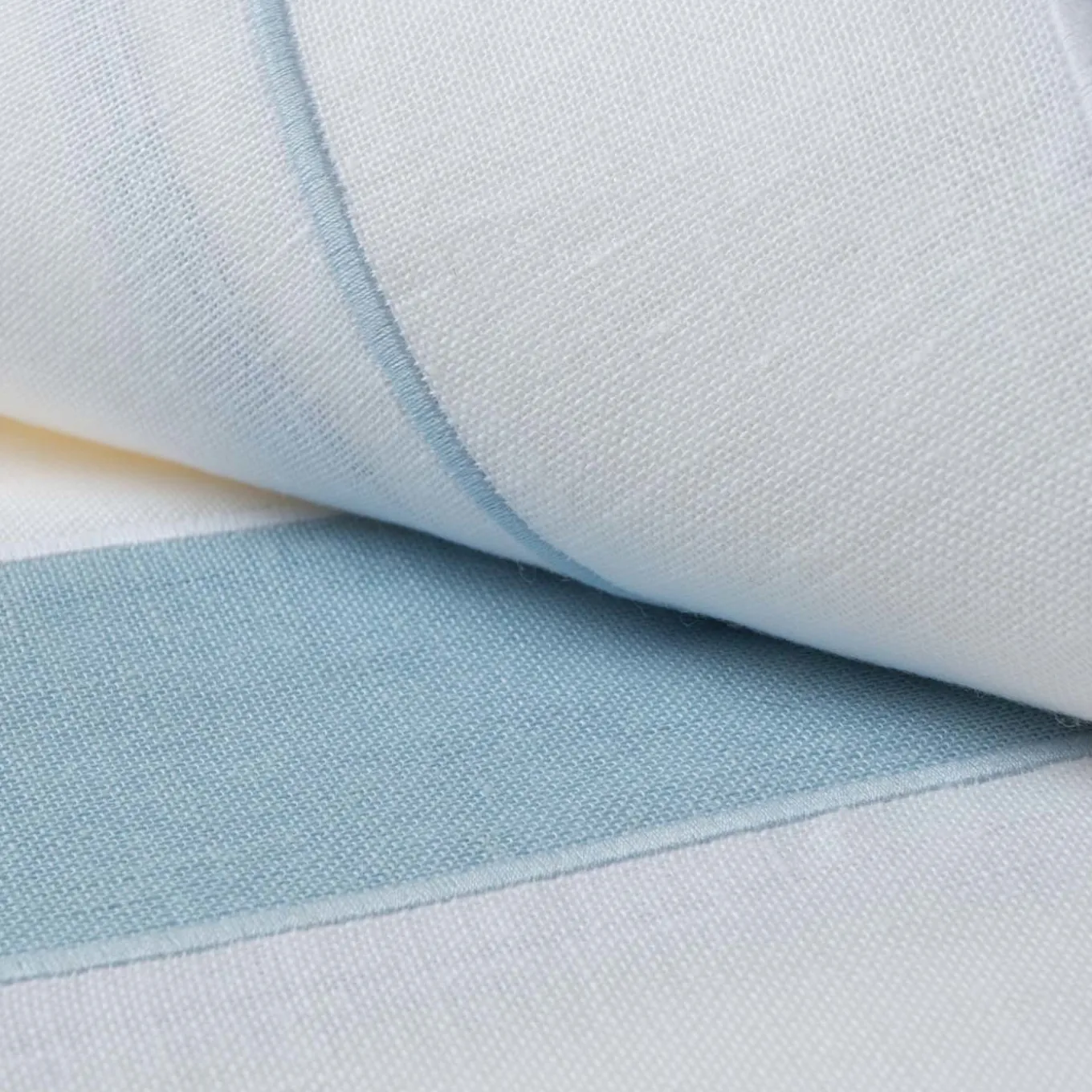Simple elegance which will grace any table with the drape of pure linen. This versatile tablecloth is the perfect addition to an everyday table and combines the formality and feel of fine table linens with a modern pattern. The border features alternating white and light blue stripes accented with a refined hemstitching in contrasting color. A piece that creates a refined atmosphere to welcome family, friends and guests to your home on any occasion. Available in many sizes contact the concierge for details.