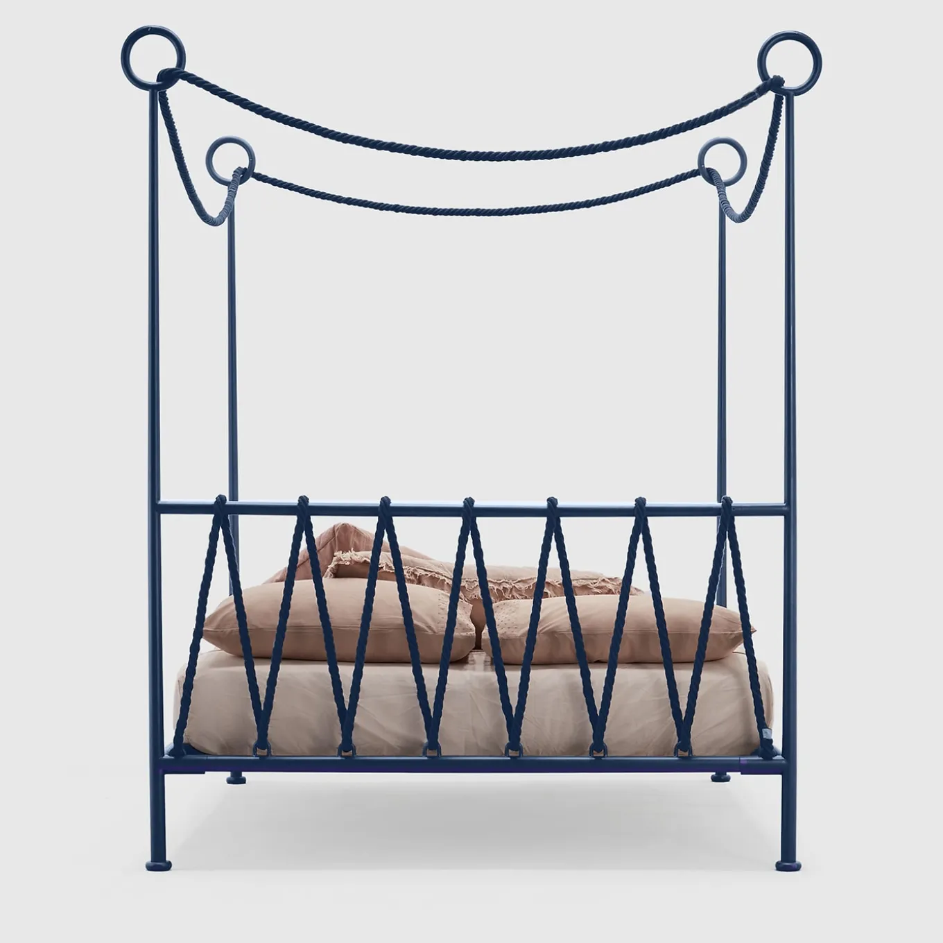 A bed that draws on the centuries-old history of the four-poster, when prized drapes once adorned its structure and protected it. A contemporary reinterpretation with a fresh, romantic, and subtly nautical touch. The frame design is elegant and clean. The round wrought iron profile rises from the foot of the bed, forming the posts and drawing solid iron circles on their summit, which welcome a soft-colored cotton top. Bed base included. The mattress is not included.