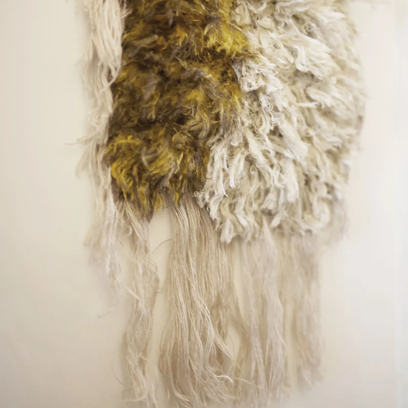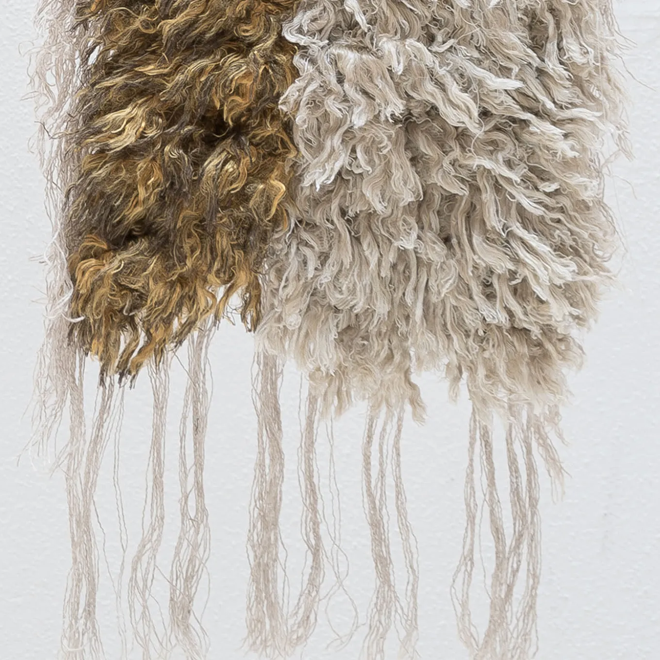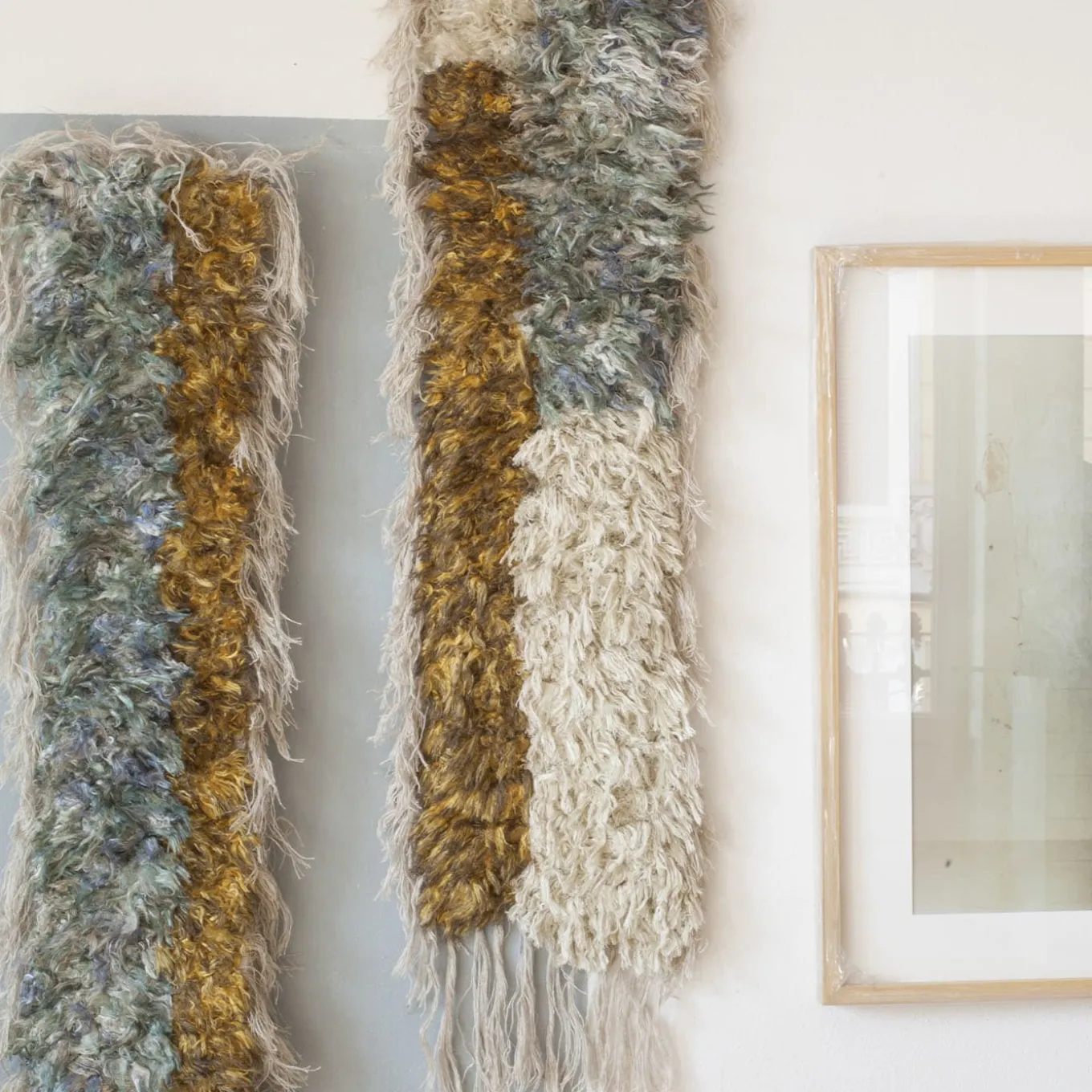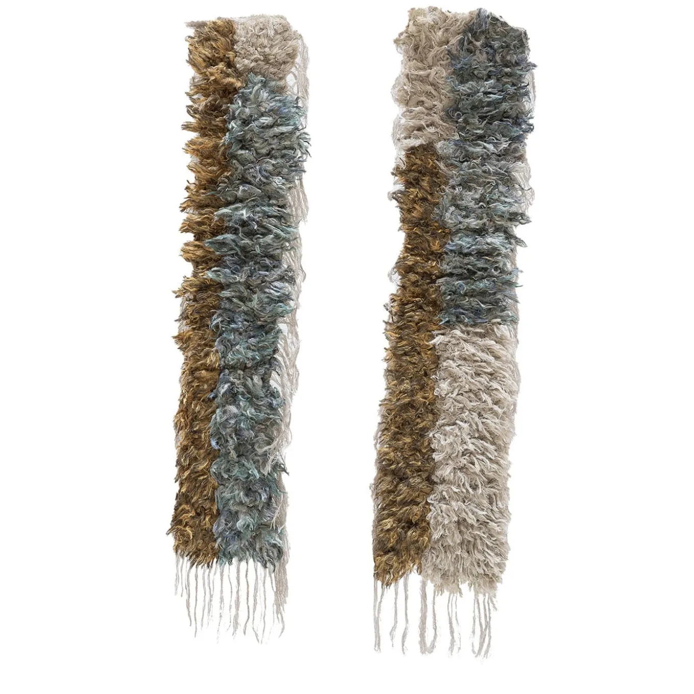 Presented at MIA PHOTO FAIR in 2021, this exclusive piece by Fibra Research is made with reclaimed Made In Italy textiles. White, light blue, and brown fibers are combined without a loom in vertical patterns, revealing soothing geometric configurations that will effortlessly pair with modern decors. Equipped with a slit to insert a rod for hanging, not included with purchase. It is the only diptych tapestry in this collection where one part is mounted on a frame (5 cm thick) and the other part is not (it rests directly on the wall). This choice allows the work to relate to the surrounding space.