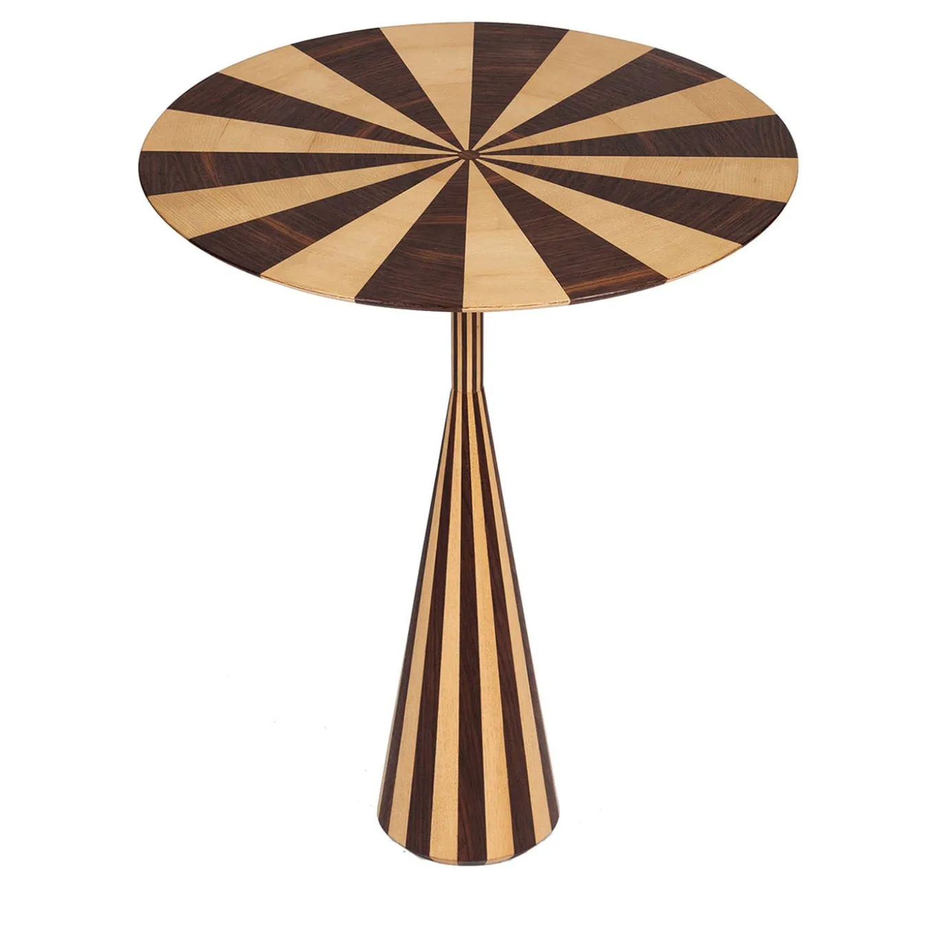 The captivating allure distinguishing this round tea table draws inspiration from the fragile balance of life. Part of the Circensi Collection, the design is marked by a wedge-like motif achieved by alternating stripes of ash and Rio rosewood. The top is supported by a conical base that almost tappers to a sharp point as it approached the top. A version with set-in marble top is available.