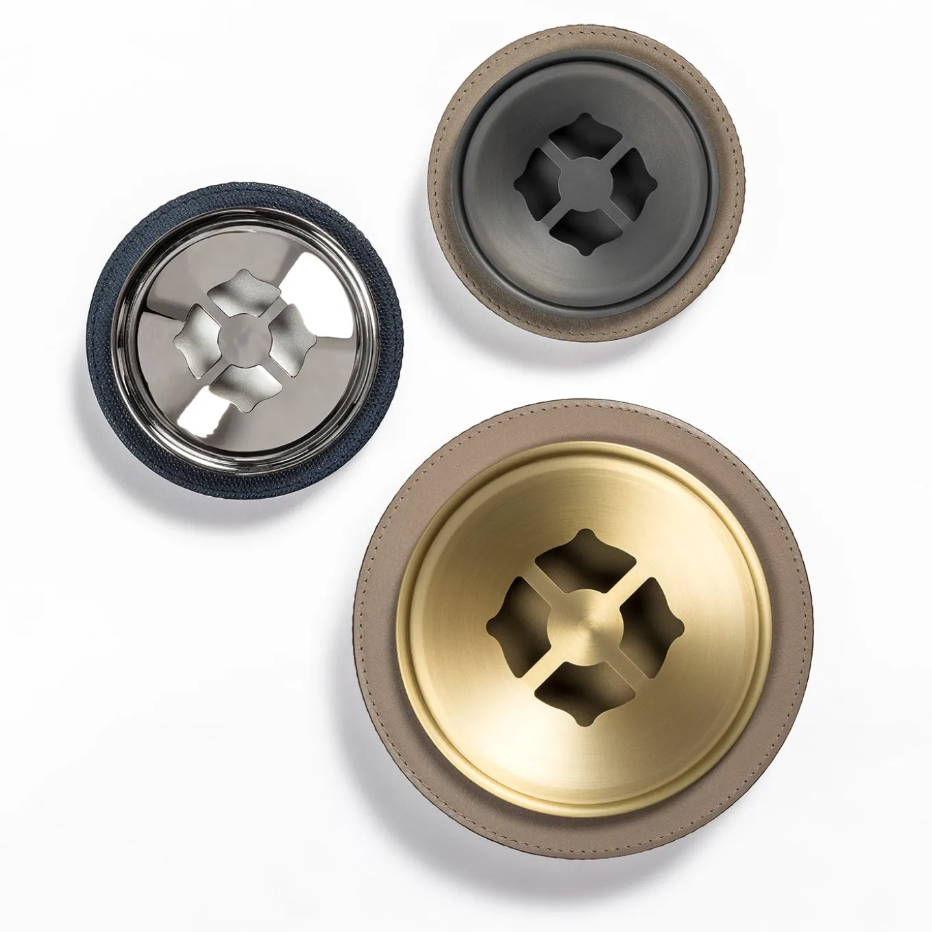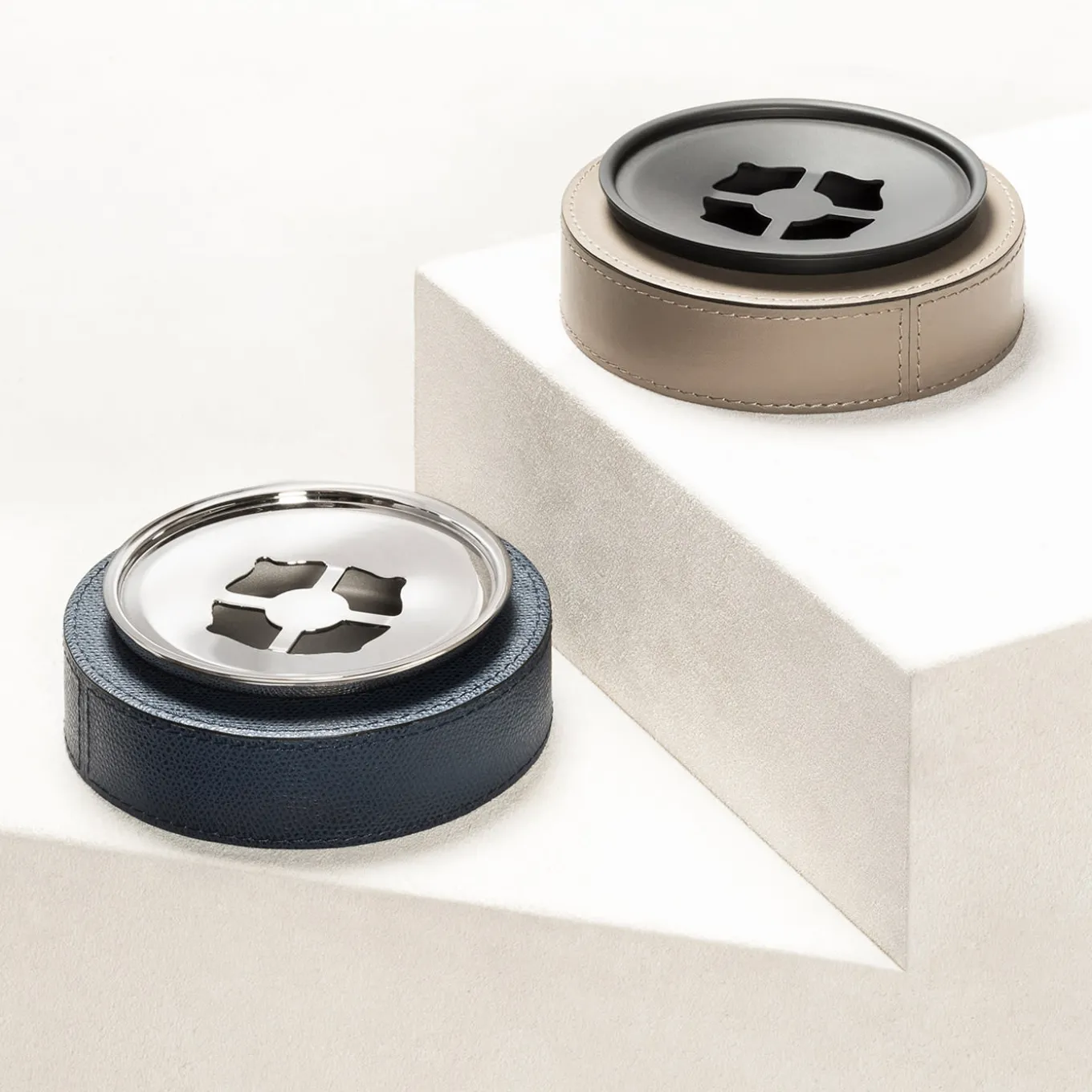 Leather-covered wood structure. Removable brass ashtray available in three finishes. Metal finishes available: chrome / bronze / brass.