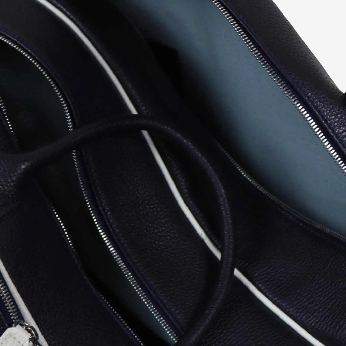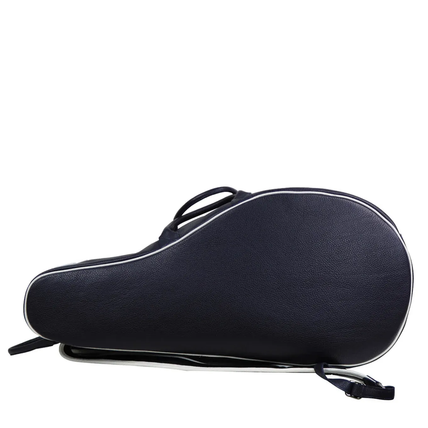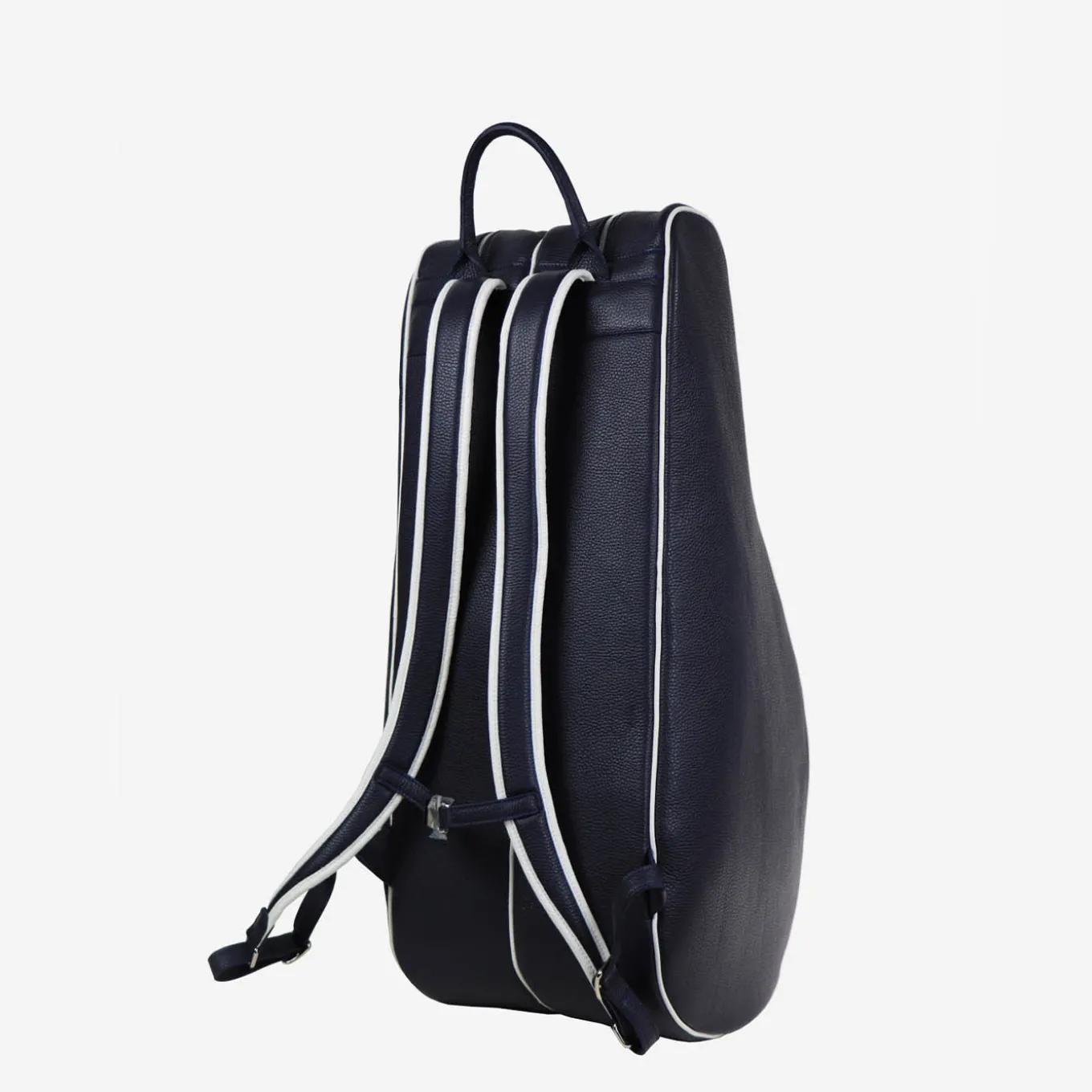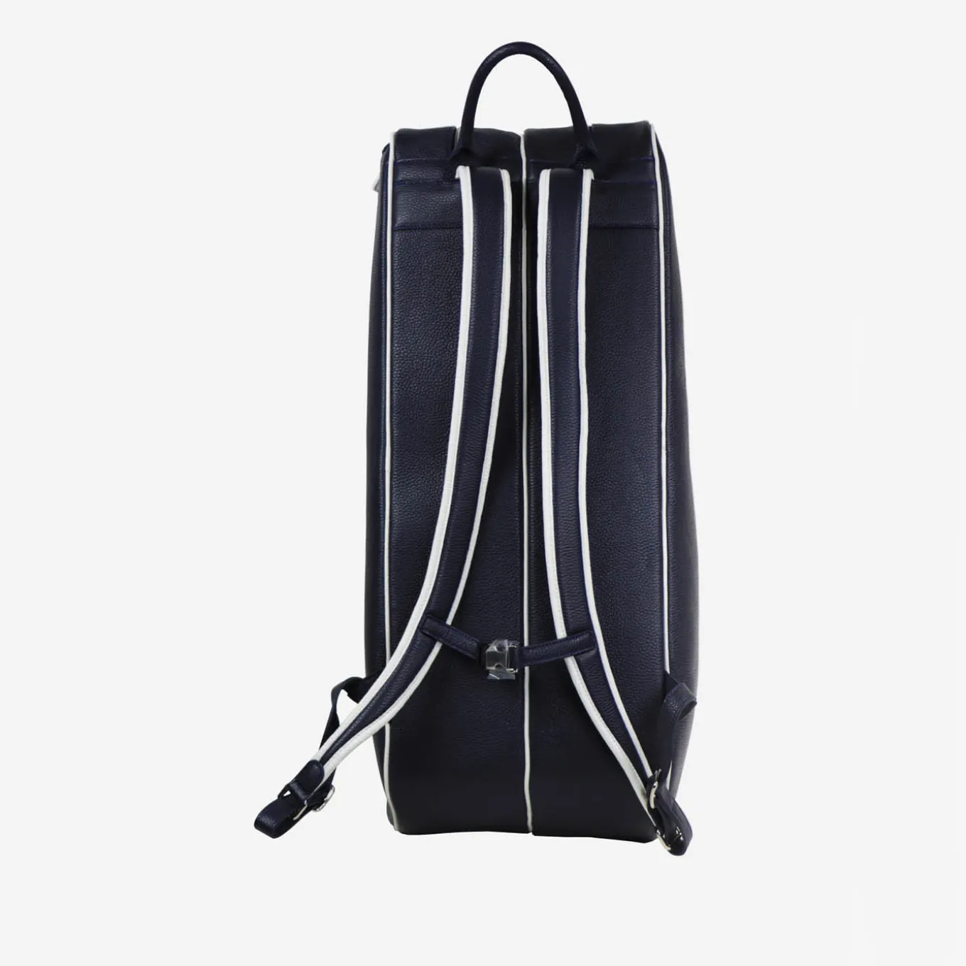 Simplicity and elegance distinguish this precious tennis backpack handcrafted of fine water-resistant leather in a deep-blue hue with contrasting white pipings. Featuring both handles and straps, it is equipped with two shaped pockets housing two rackets each that add to other compartments for shoes and other sports equipment. Adjustable straps are included. Customizable with one’s initials.