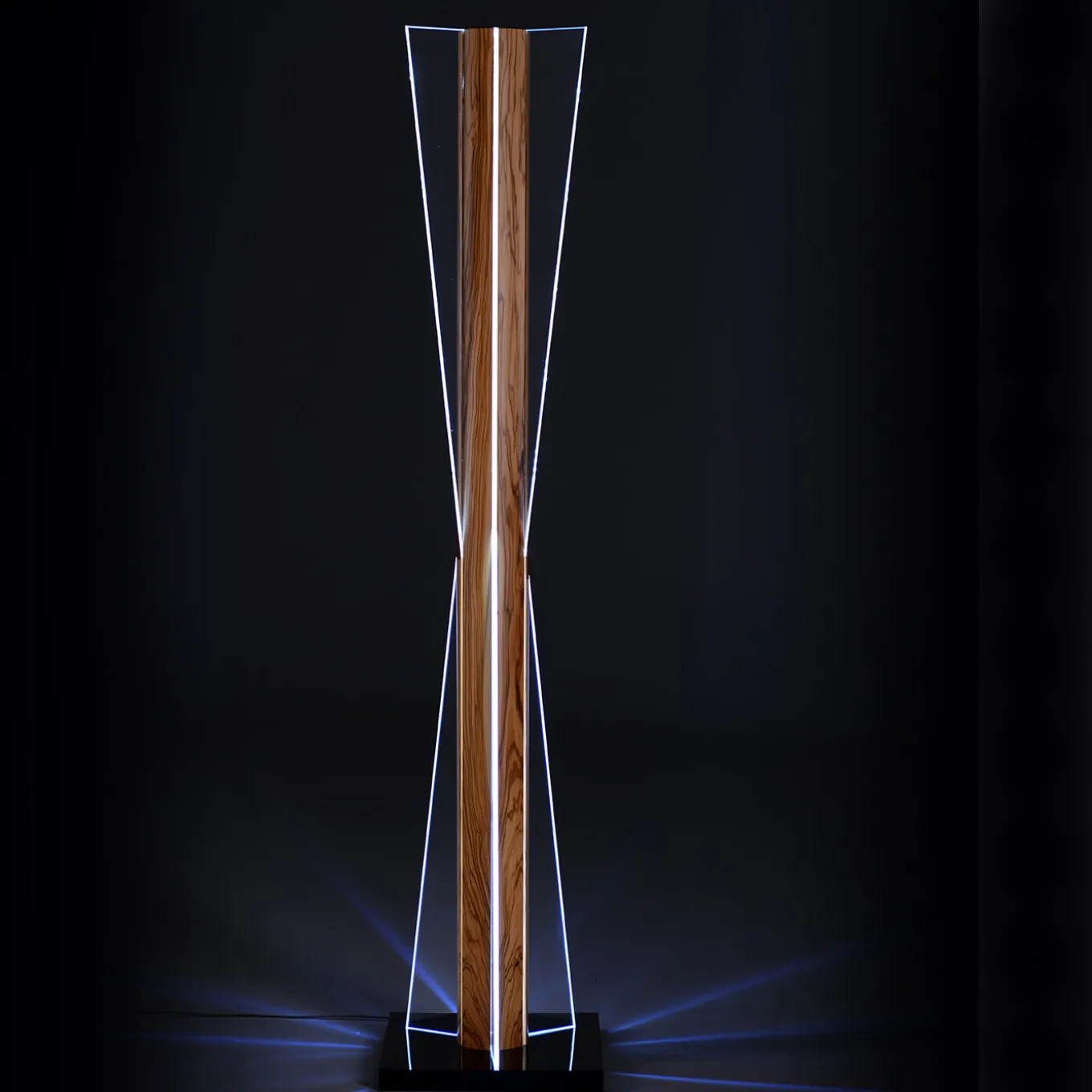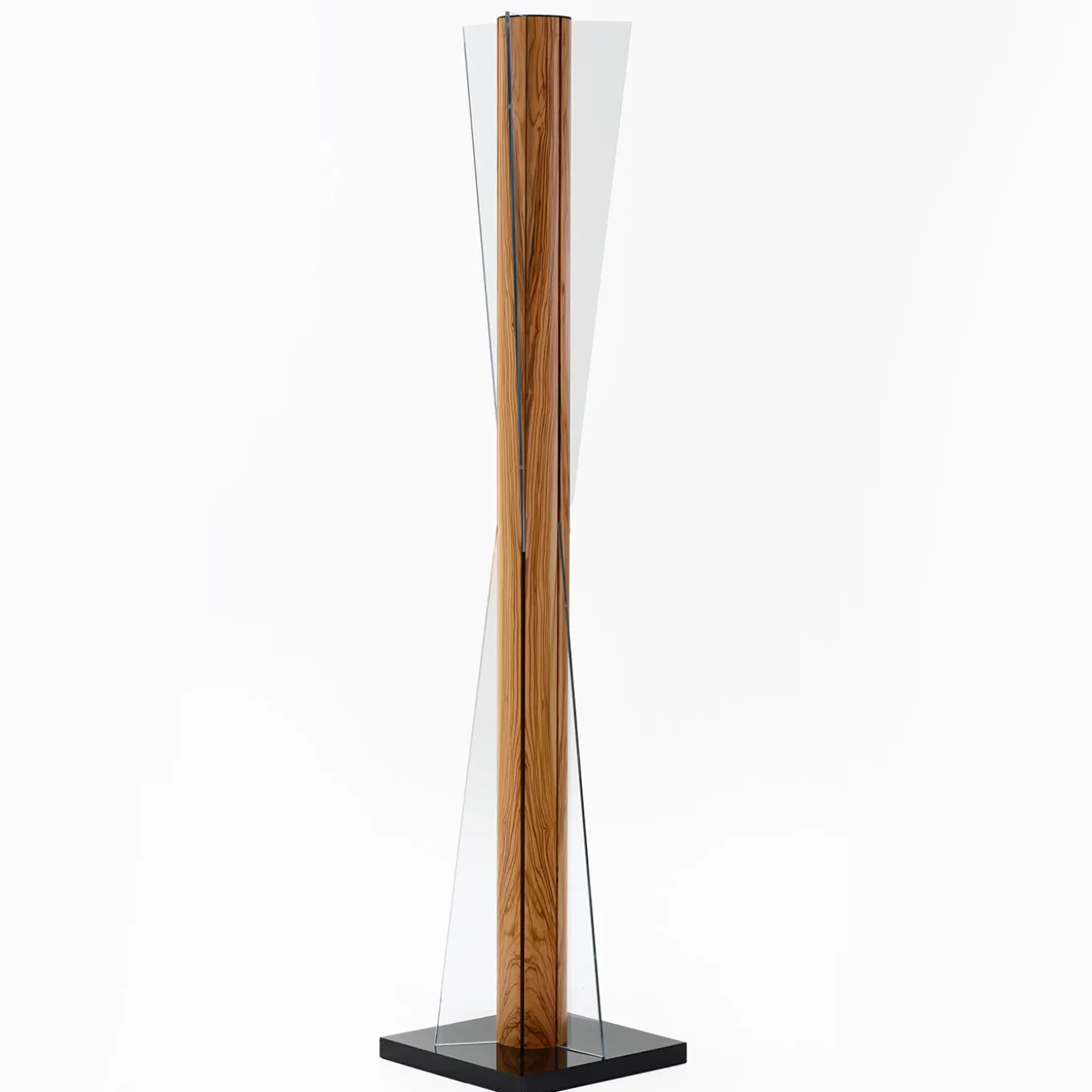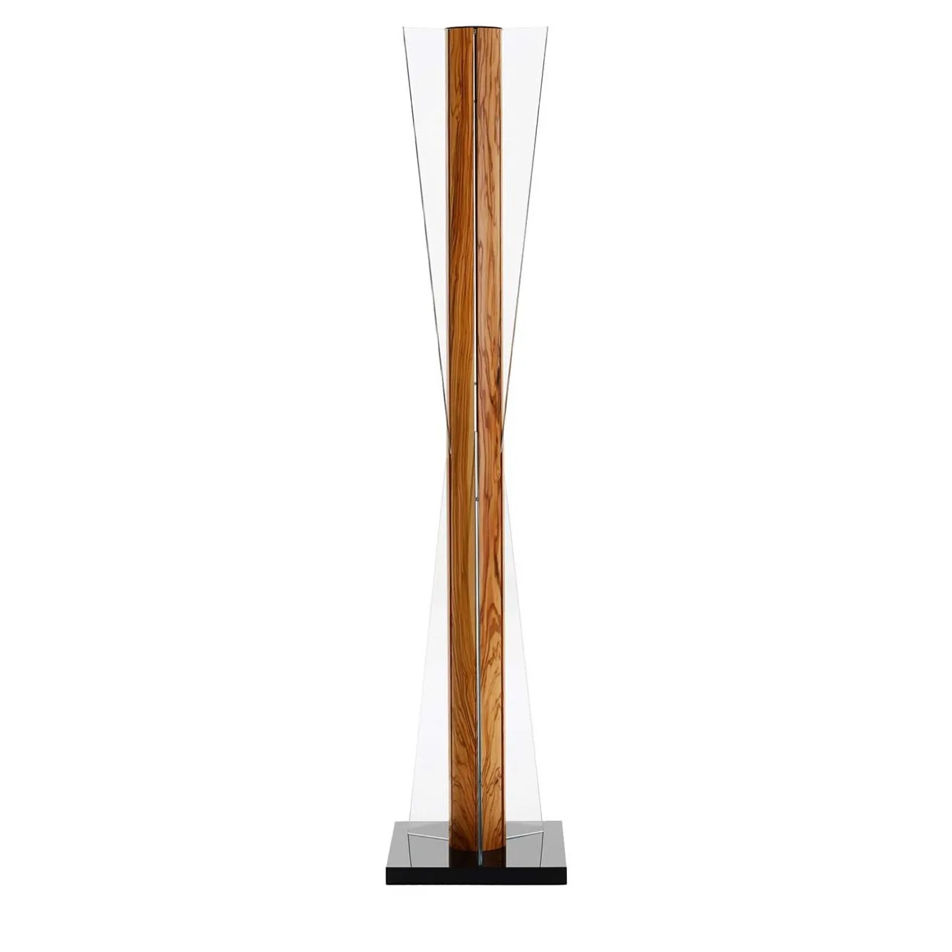This elegant floor lamp evokes the silhouette of an hourglass, the ancient symbol for time, combined with an olive wood structure, which represents nourishment, tradition and life. Its design is both modern and classic, for a unique elegance and style. Made from olive wood, parapan and tempered glass. White LED light. Part of the company’s Carpentry Collection.