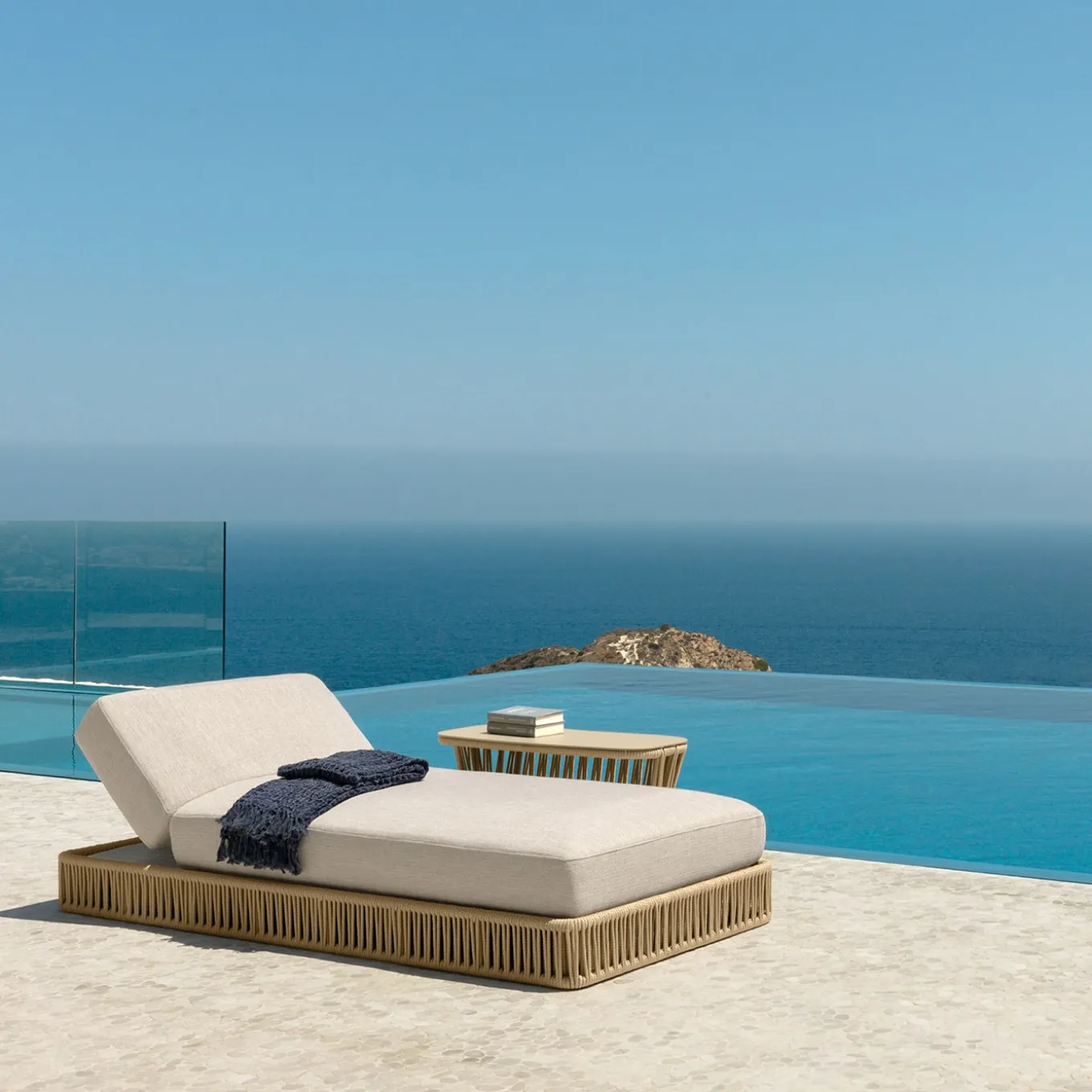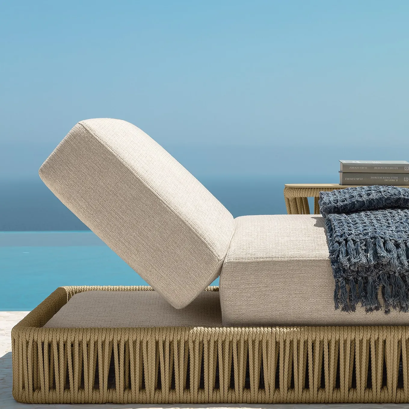 A stunning design by Ludovica and Roberto Palomba, this exquisite sunbed will adorn a contemporary poolside with charm. Defined by a soothing beige palette, it features stunning details made of hand-woven nautical rope. The aluminum frame is enriched with softly padded and fabric-upholstered cushions.