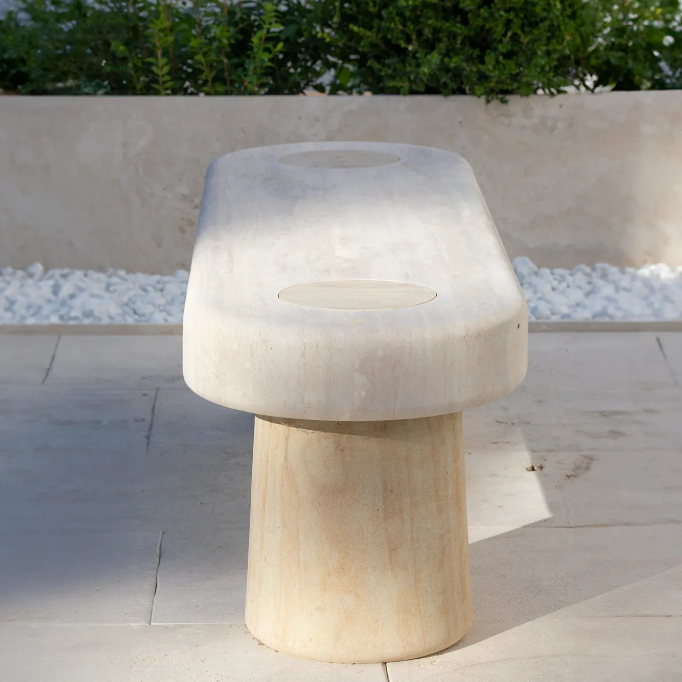 The Clio bench features a minimalist travertine seat resting on two cylindrical bases in warm golden stone. Its refined silhouette emphasizes the natural beauty of limestone, enhanced by a polished, stuccoed finish. A harmonious balance of elegance and solidity, this piece is ideal for both indoor and outdoor environments where sculptural simplicity meets artisanal sophistication.