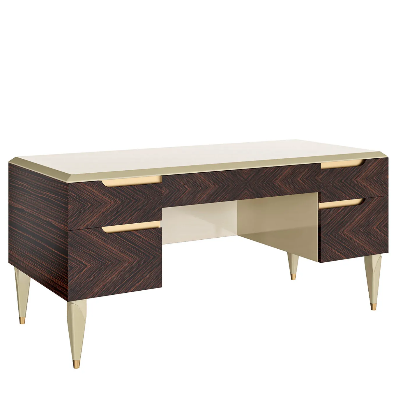 A precious piece of functional decor to complement a home study or office of both traditional or modern inspiration, this writing desk is skillfully crafted by expert artisans specialized in Italian wood manufacturing tradition. Combining a light gray lacquer with a fascinating dark ebony veneer, the piece is enriched with gold leaf details. Please contact the Concierge for more information.