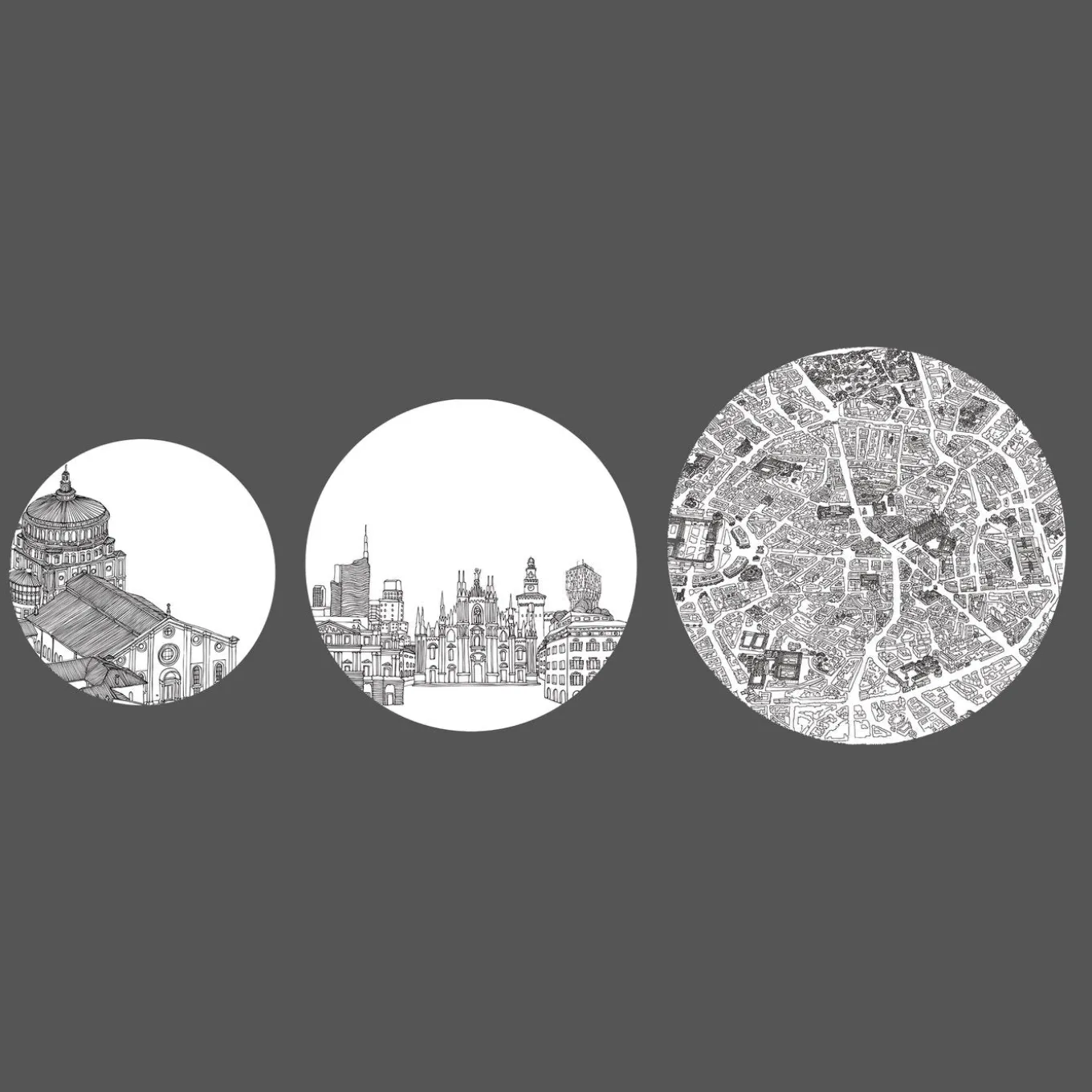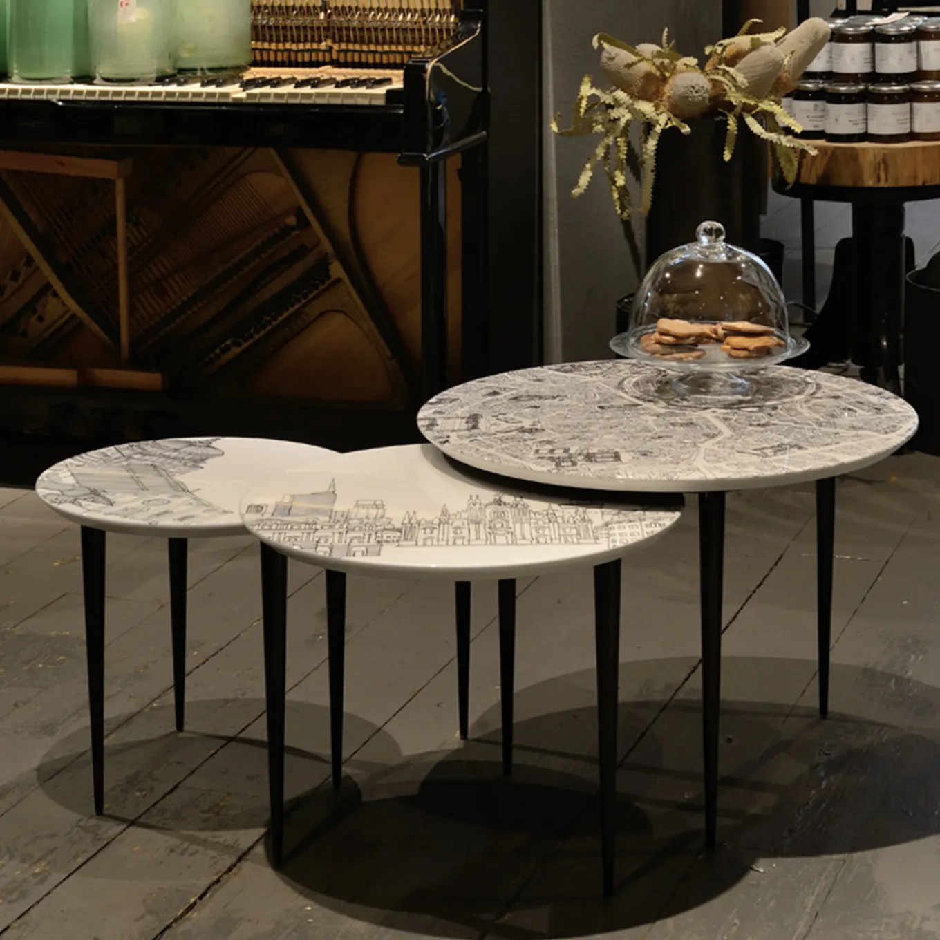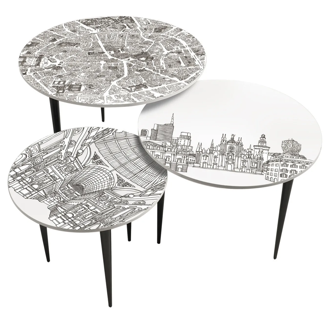Designed by Anna Sutor for Extroverso, these exclusive nesting tables are made of wood with a glossy finish and feature black conical legs with white round tops accented with printed illustrations of the iconic urban landscapes of Milan from three different perspectives. Functional and chic, this set includes three tables (diam 60xh45 cm, diam 50xh42 cm, diam 40xh39 cm) that will create a focal point in any living room decor, either nested together for an eye-catching center piece or staggered as end tables to create depth.