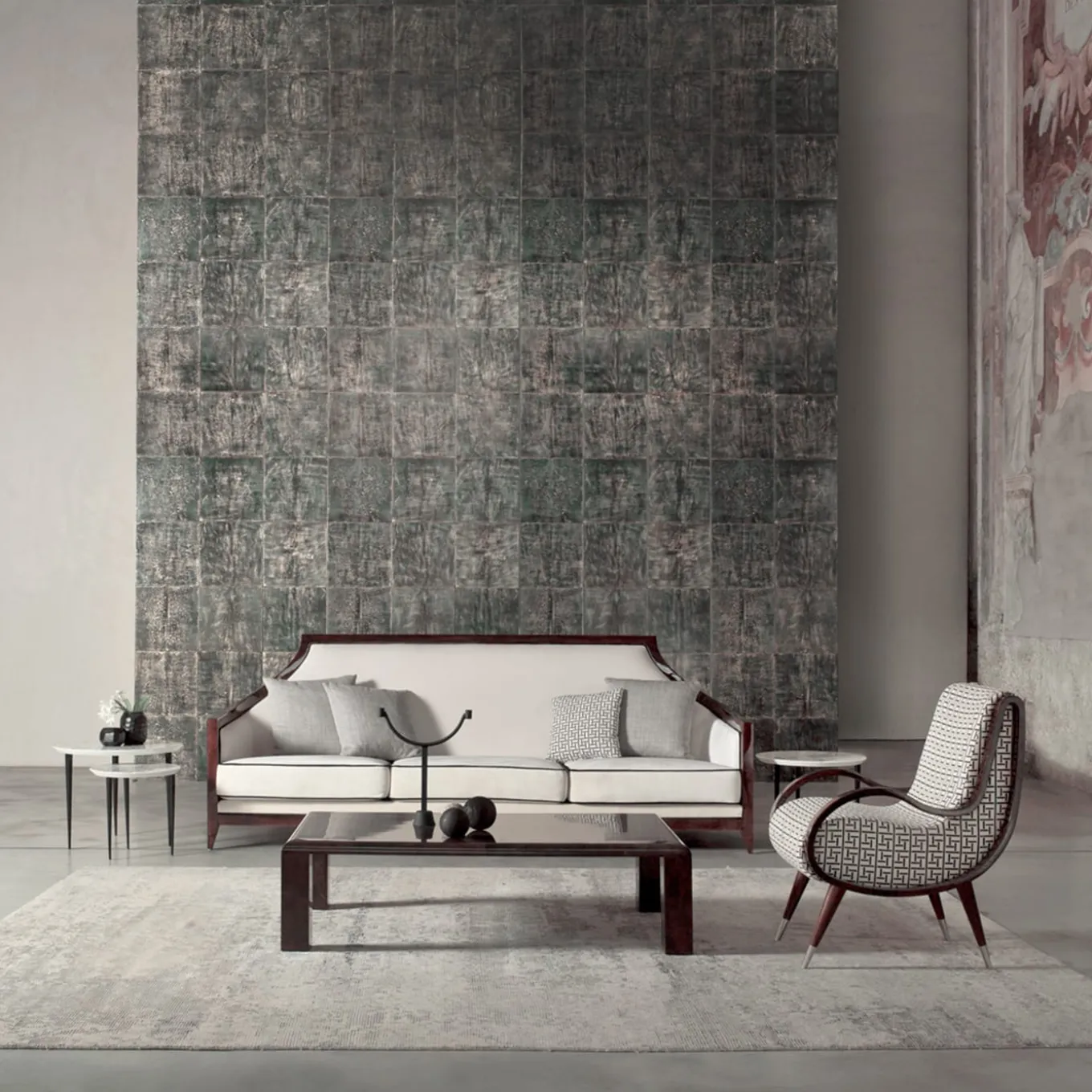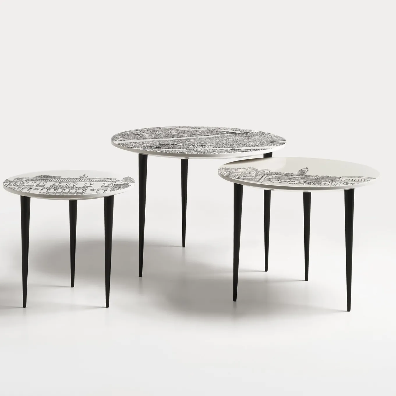 The 3-table set of the Venezia series designed by Anna Sutor represents a close look at the iconic landscapes of this Italian city depicted in their essence. Inspired by a series of small tables by great designer Aldo Tura, these modern-style tables are entirely made of wood with slim, conical legs finished in lacquered black and white round tops, where the printed black drawings stand out in their pure, simple lines. These tables measure diam 60xh45 cm, diam 50xh42 cm, diam 40xh39 cm and will bring a captivating atmosphere in any living room decor.
