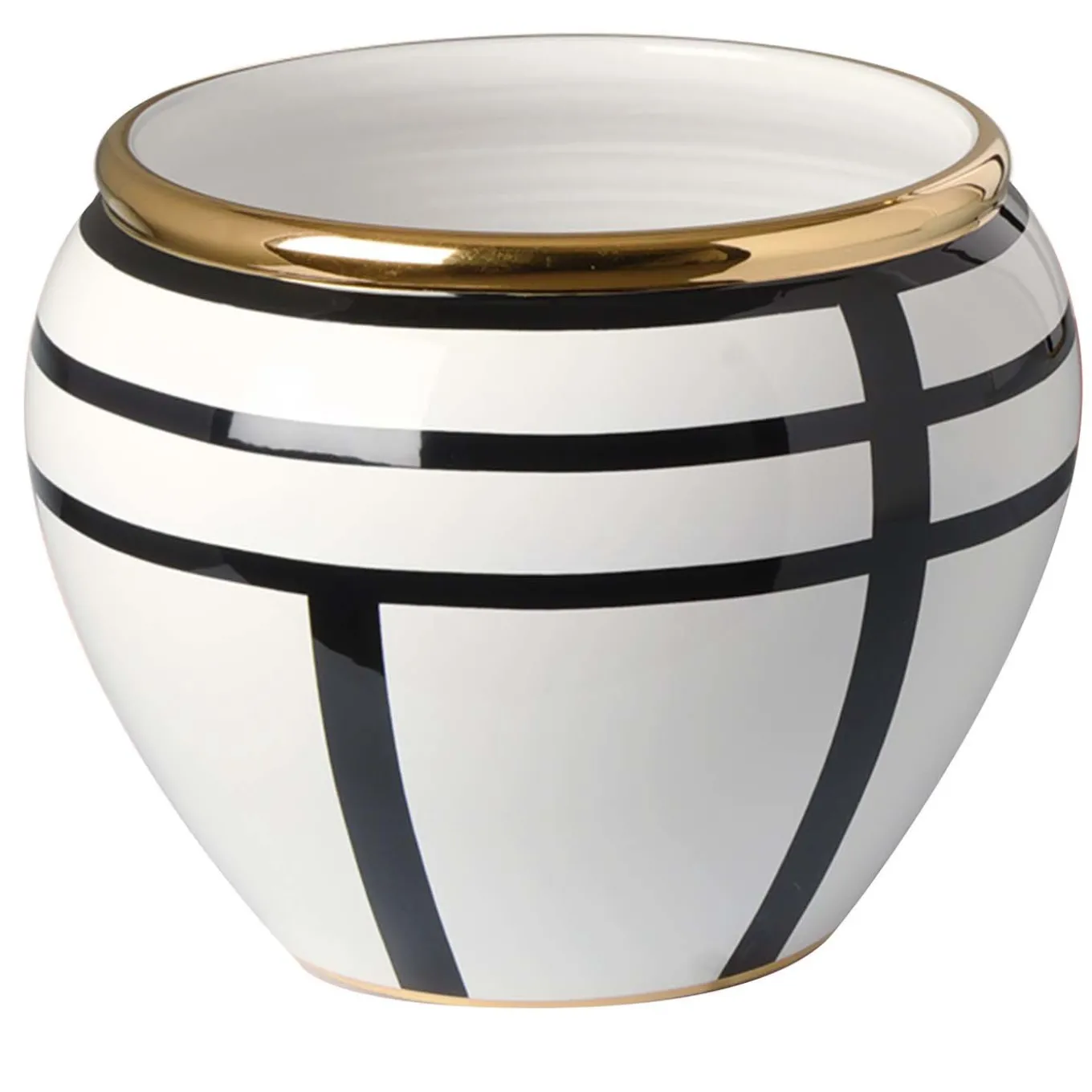 This 1960s-inspired cachepot conveys a strong and glamorous character from the perpendicular black stripes gracing its bulging white porcelain silhouette. The choice of black-and-white lends this piece a timeless allure, enriched by the glossy golden nuance of the edge.