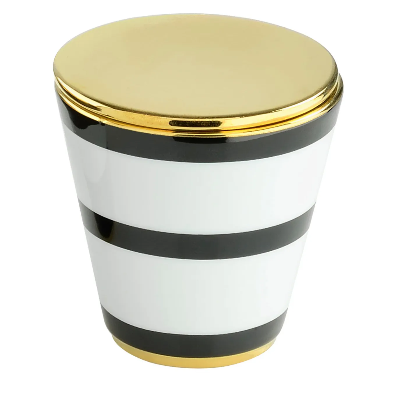 Stunning display for a contemporary console or coffee table, this exquisite candle will make a singular housewarming gift for friends or family. Patterned with three black stripes, its clean and simple shape is handcrafted of fine white porcelain. The lid and rims are painted with pure polished gold.