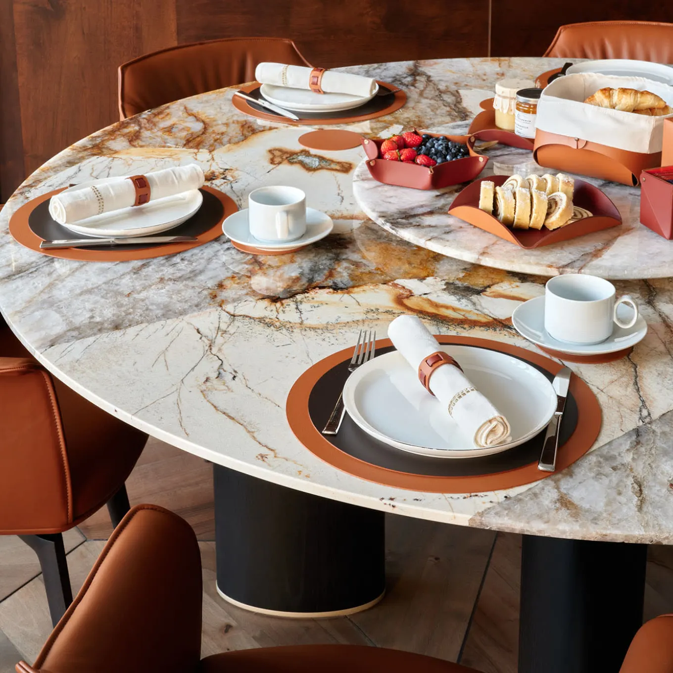 A holder for sauces and spices provides an elegant solution to safeguard tablecloths and surfaces from stains caused by these essential elements. The leather surface is specially treated to resist greasy and caustic food products, ensuring durability, easy maintenance, and a timeless appearance. The color scheme, cognac and bordeaux, adds sophistication to the design. Designed by Ekaterina Borovkova.
