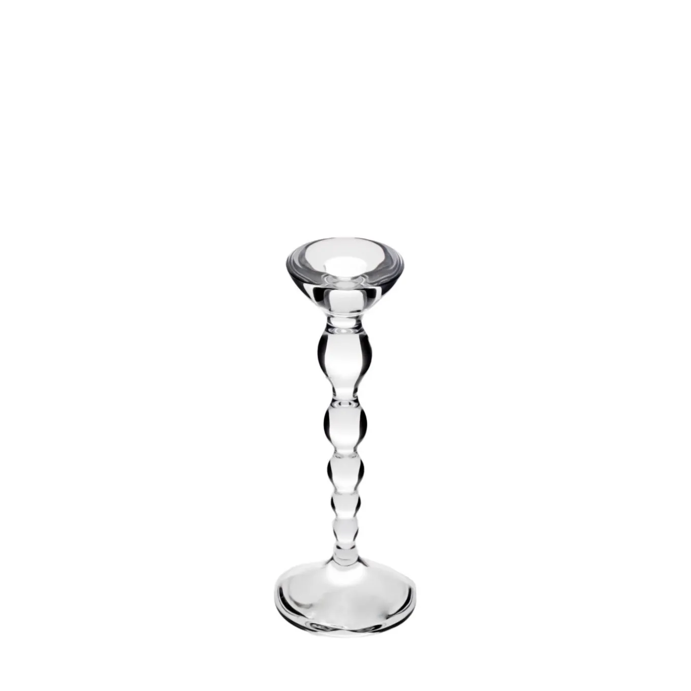 The elegant spiraling handle of this delicate candlestick recalls the beads of a necklace. An original design by ColleVilca, renowned for the excellent transparent quality of its crystal, in a slightly smaller version.