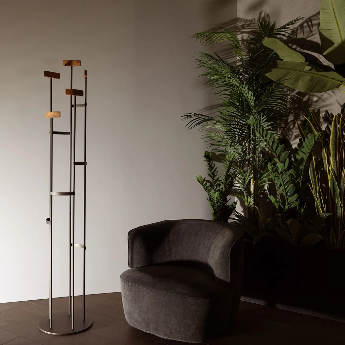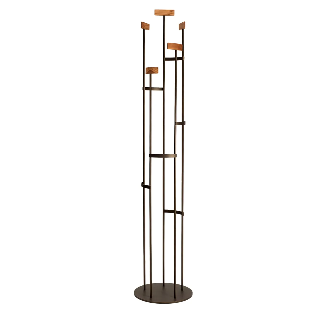 This coat stand is a conceptual sculpture that beautifully merges aesthetics with functionality. Crafted from metallic brown-painted iron (Medici brown), it rises like a column, elegantly defining the space around it. The curved wooden crossbars at the ends introduce warmth and a natural touch, creating a refined contrast with the metallic structure. Ideal for hanging coats, scarves, and hats, this piece enhances any environment with its sculptural presence and practical design.