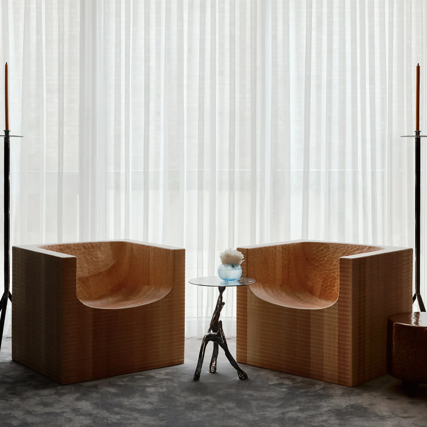 A testament to contemporary sculptural design, this armchair boasts a monolithic silhouette made of vertical wooden fibers, chiseled and finished by hand with a planer. Displaying a refined and unique texture celebrating traditional craftsmanship, it will make for a stately and iconic accent to a living environment. Please consult the Concierge for further information.