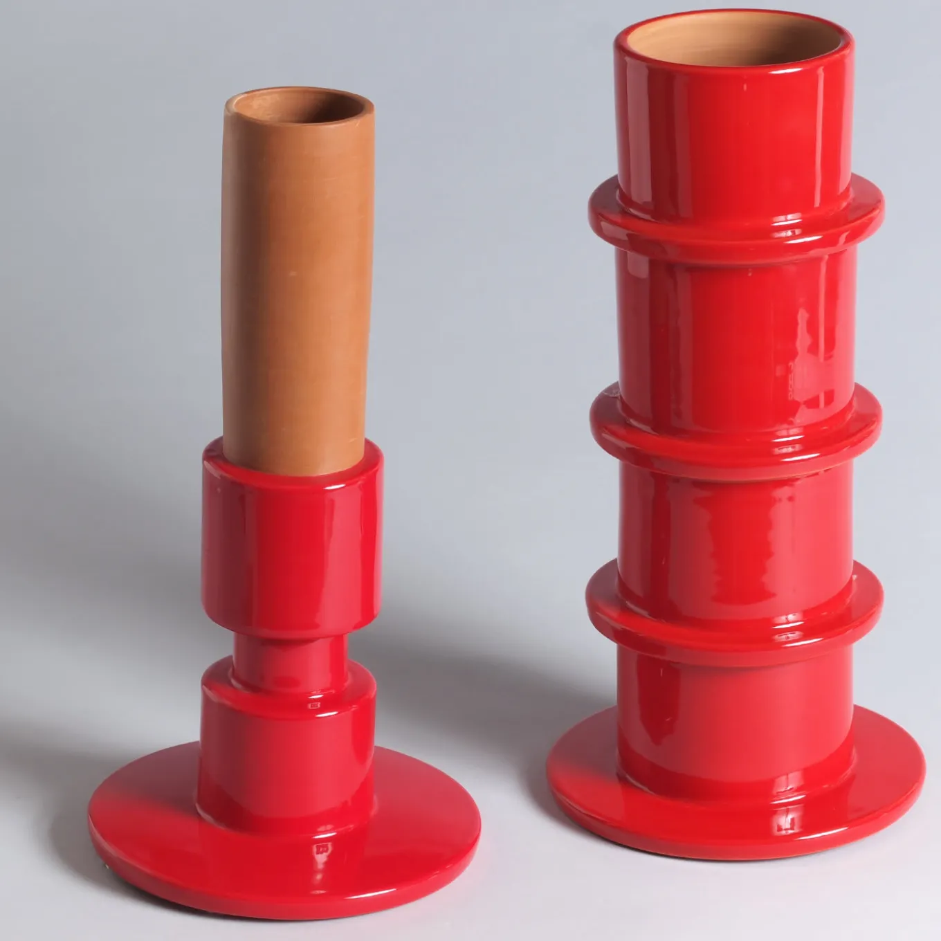 Part of the Composizioni Collection of one-off designs with the double function of vases and abstract sculptures, this precious piece exemplifies the endless creative potential of Faenza pottery. Its harmonious silhouette in glossy, red-glazed majolica exposes warm bisque sections when the two interlocking, structural elements are detached and transformed into slender vases. Handcrafted by master Pier Paolo Garavini, the design was conceived as an artistic take on future urban landscapes.