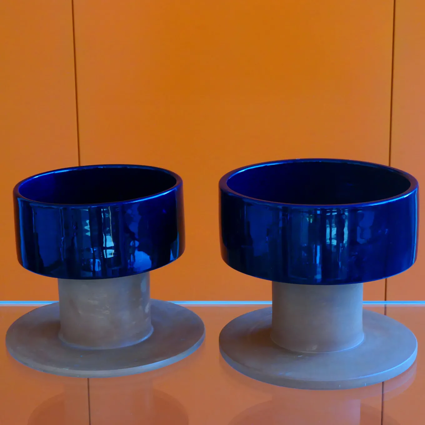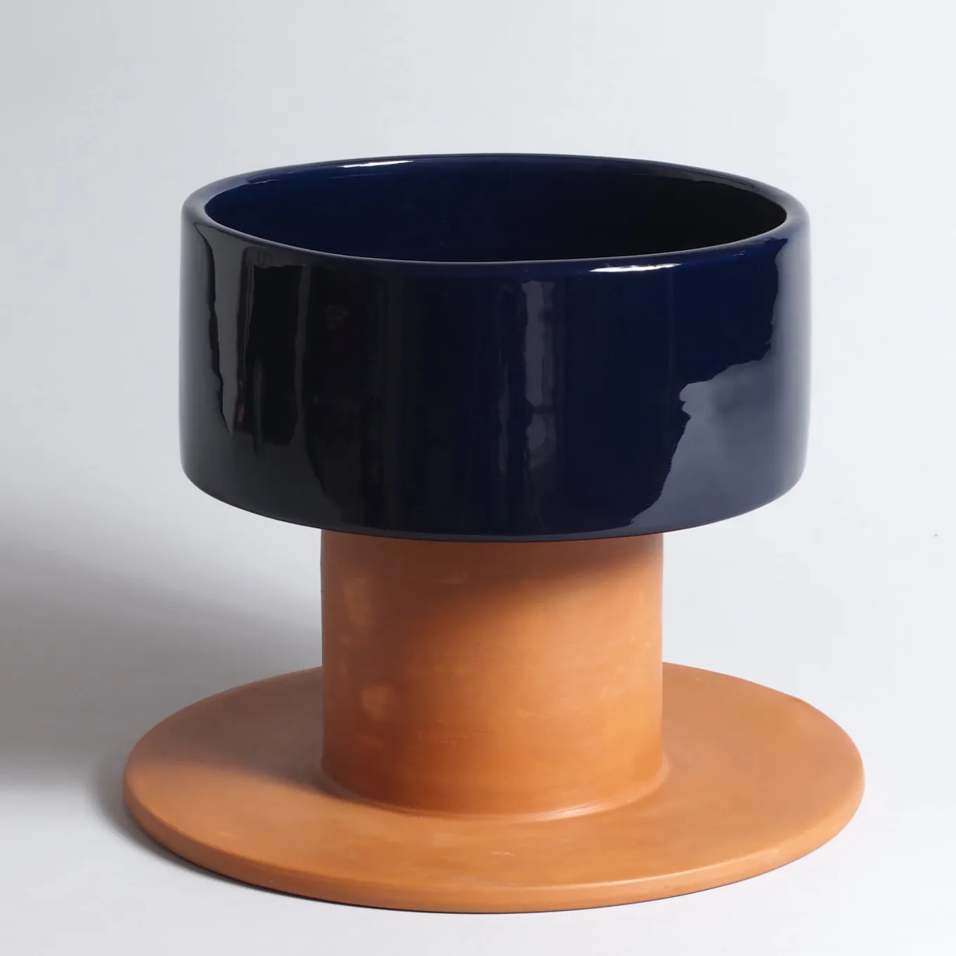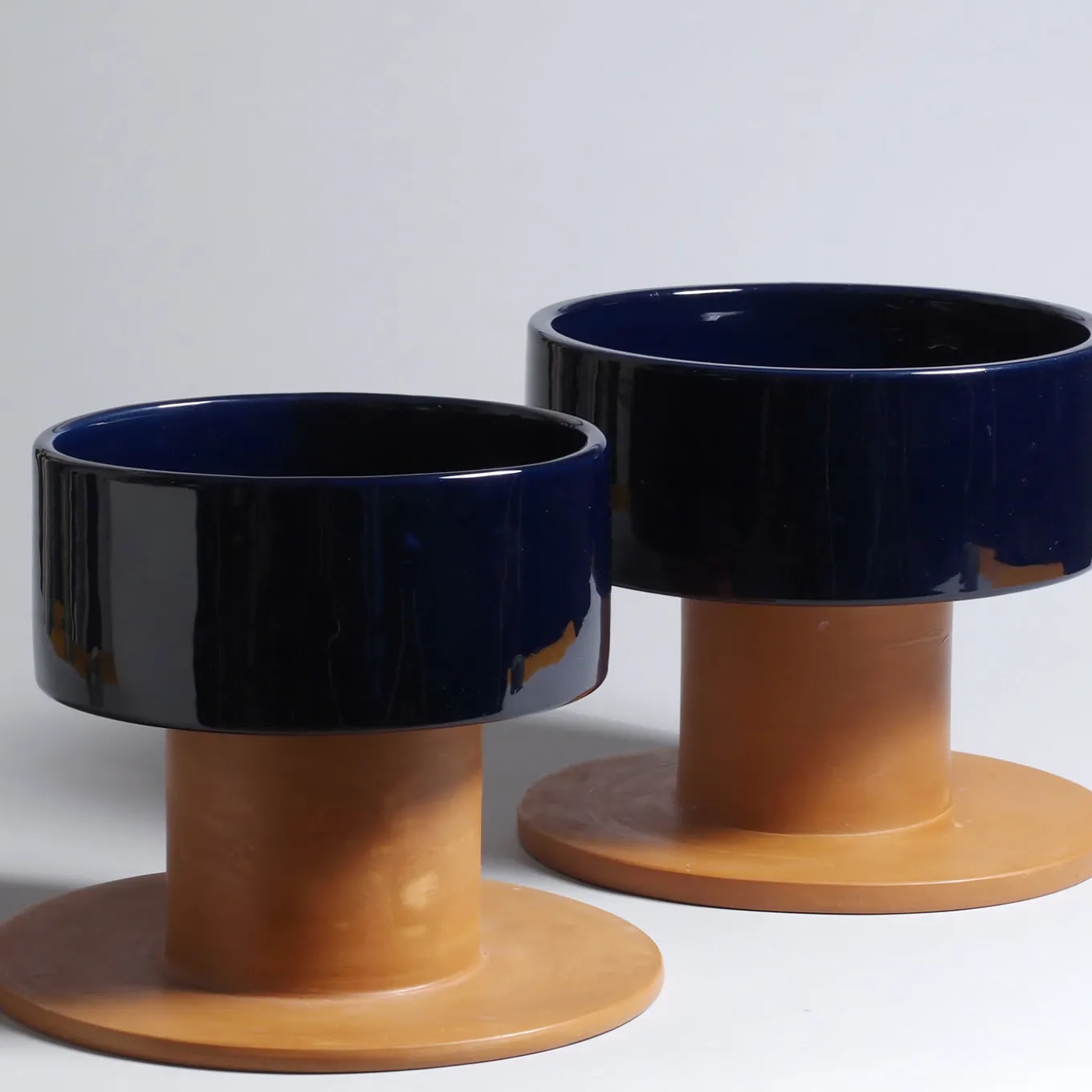 Two elements recalling medieval goblets are interlocked in this singular sculpture, creating a symmetrical body with alternating midnight blue-glazed majolica and bisque terracotta pieces. Once the two elements are detached, the design discloses its functional potential going beyond the simply decorative purpose. A superb example of handcrafted ceramic from Faenza, this piece from the Composizioni Collection was also published in a book by Viola Emaldi in 2016.