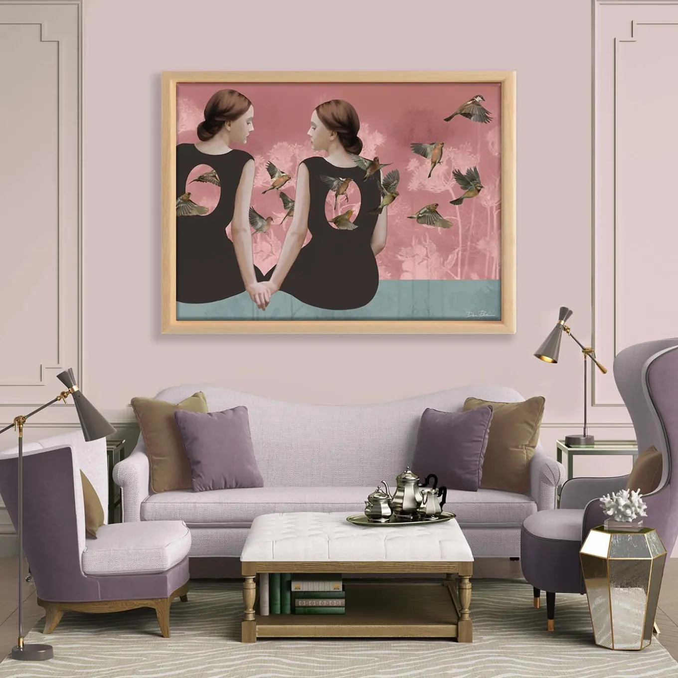 Part of a signed and numbered Limited Edition, this Pop-Surrealist digital painting depicts the intimate bond between two female figures holding hands. A flock of bird passes by, representing their secret, shared imagination. Printed on high-quality cotton canvas mounted on dry spruce wood. Basswood box frame. Certificate of Authenticity included.