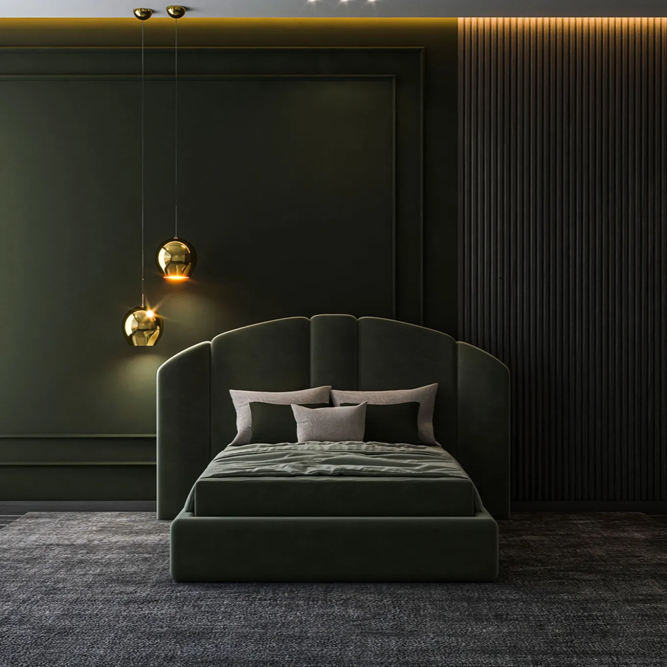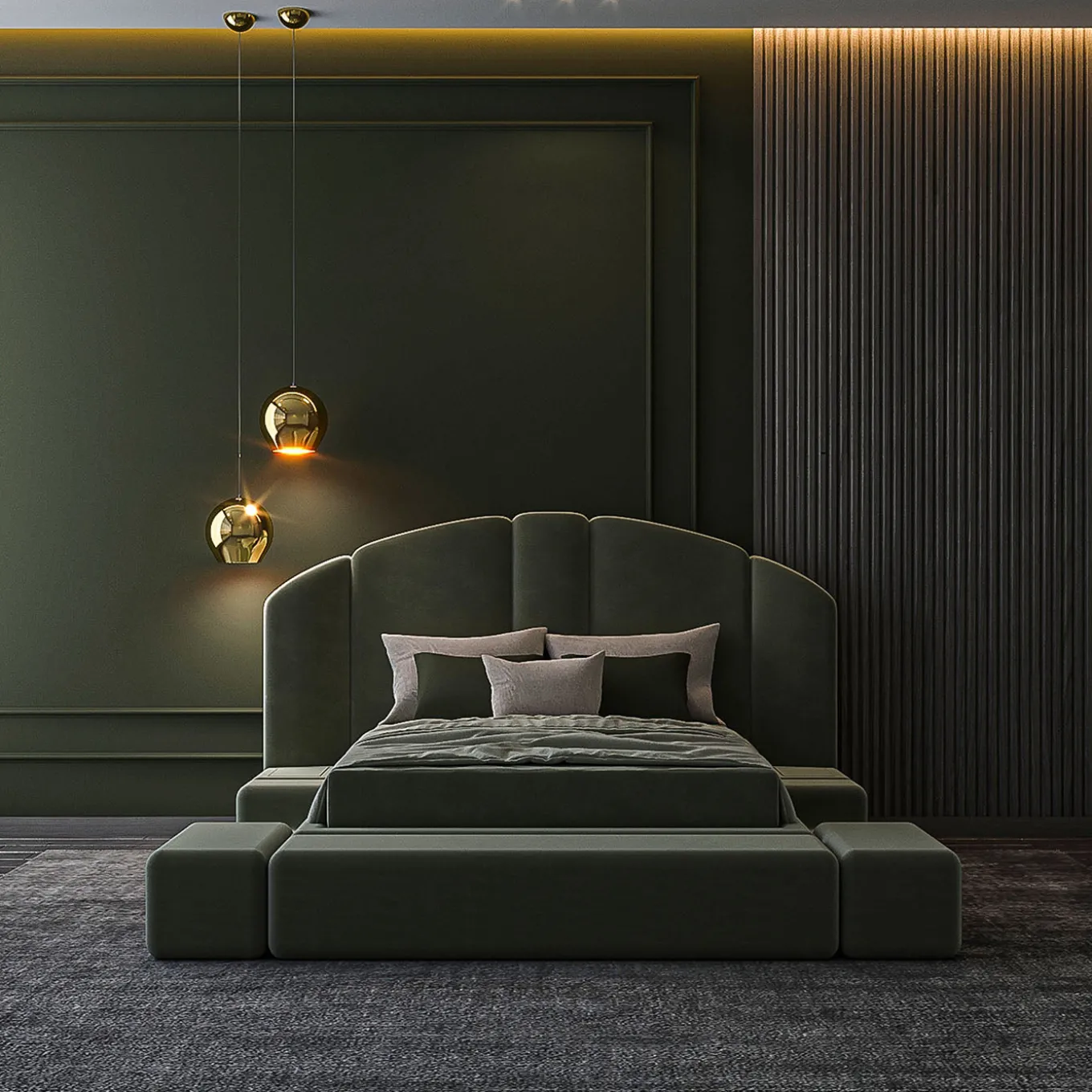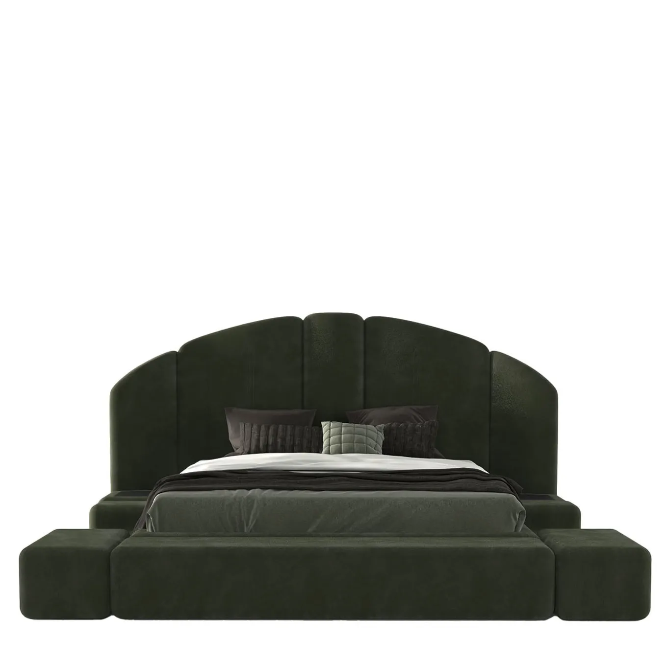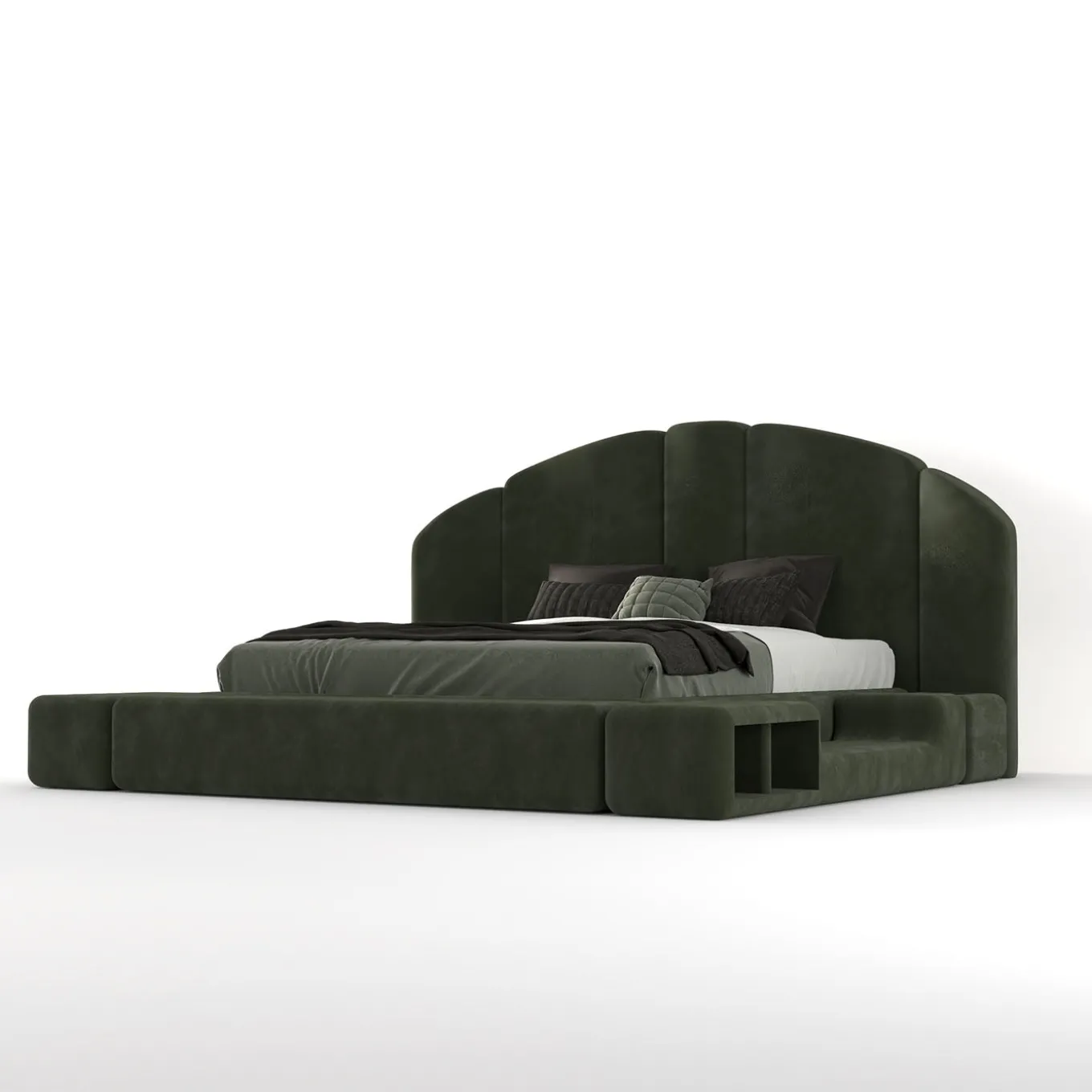 Concept 01 is a modular upholstered bed distinguished by its versatility and customizable design, allowing for a variety of refined and welcoming compositions. The structure features front and side benches, available with or without steps, and a cushioned frame padded with differentiated density polyurethane foam. It includes invisible internal feet 3cm high and metal corner supports to install the mattress frame without feet. The removable bed frame cover is finished in water-repellent moss green fabric. Also available in other finishes, contact the Concierge for more information.