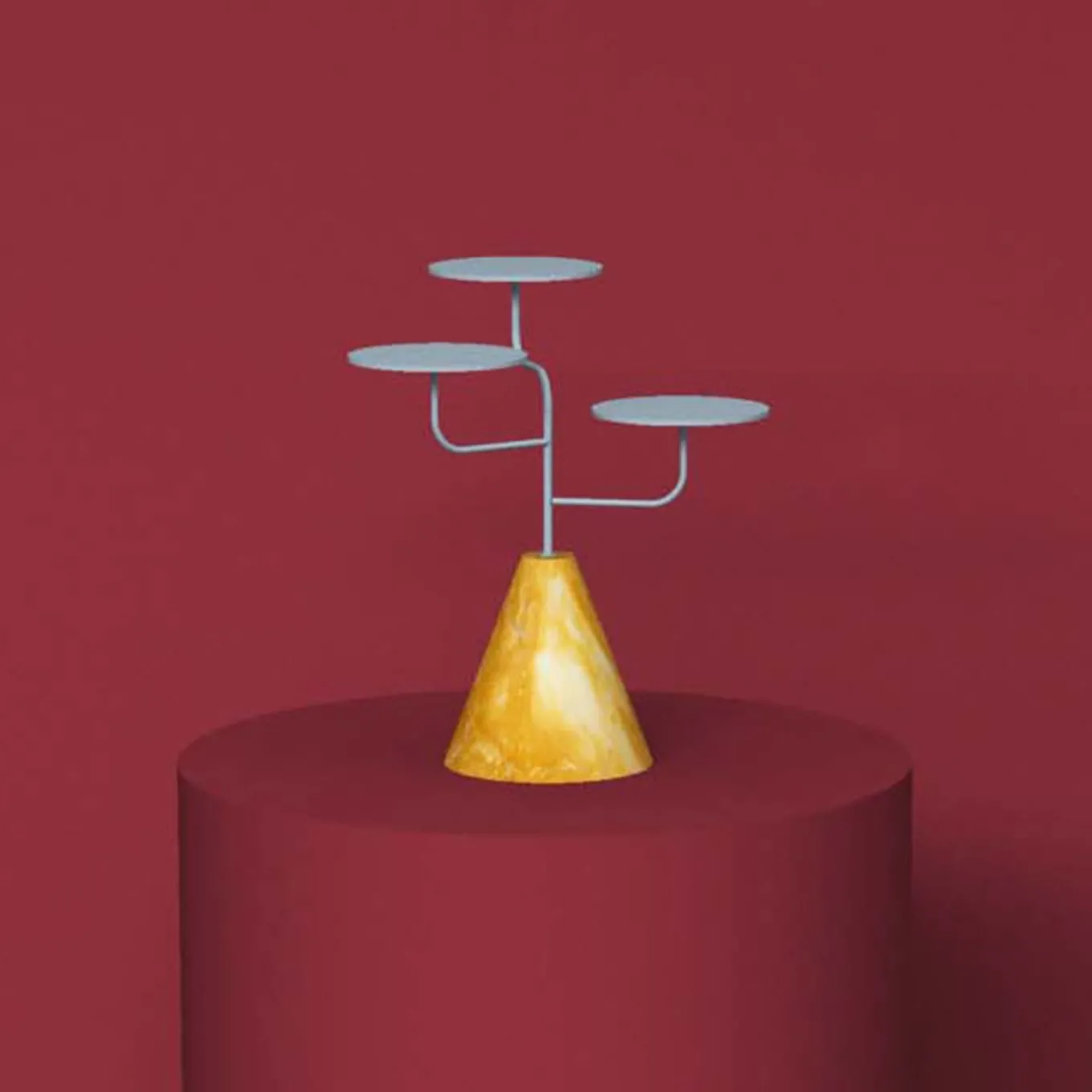 A sharp yet harmonious contrast between the warm hues of the conical base in Giallo Siena marble and the baby-blue lacquer accenting the iron frame, lend this three-tier serving stand an exquisite visual impact. Conceived to stress the concept of food as a means to make people feel close, it features three round surfaces where bowls or trays can rest sustained by dainty arms branching off from the central stem. Other colors ad marbles are available, please check details with the Concierge.