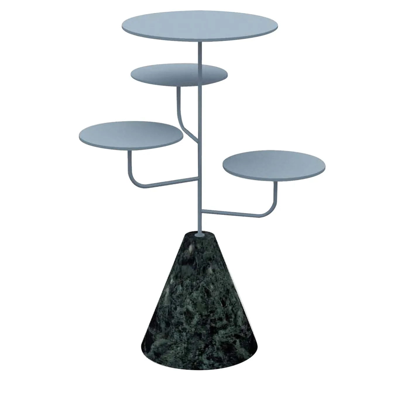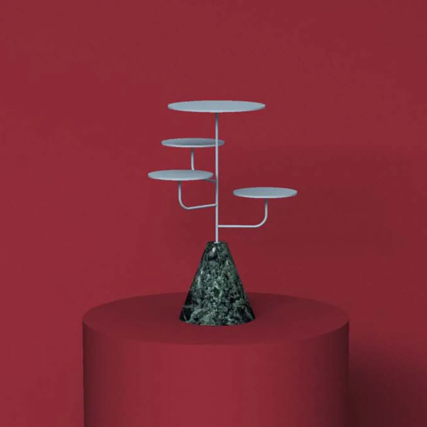 Aptly named after the Italian for “shared”, this refined four-tier serving stand in baby-blue-lacquered iron was conceived as an invitation to share food as a way to collect precious memories. Four round plates sustained by as many arms stem from a matching central element, creating a sculptural frame extending gracefully from a conical base in Green Guatemala marble, stunning in its singular veins. The design comes in other color and marble options, please ask the Concierge for details.