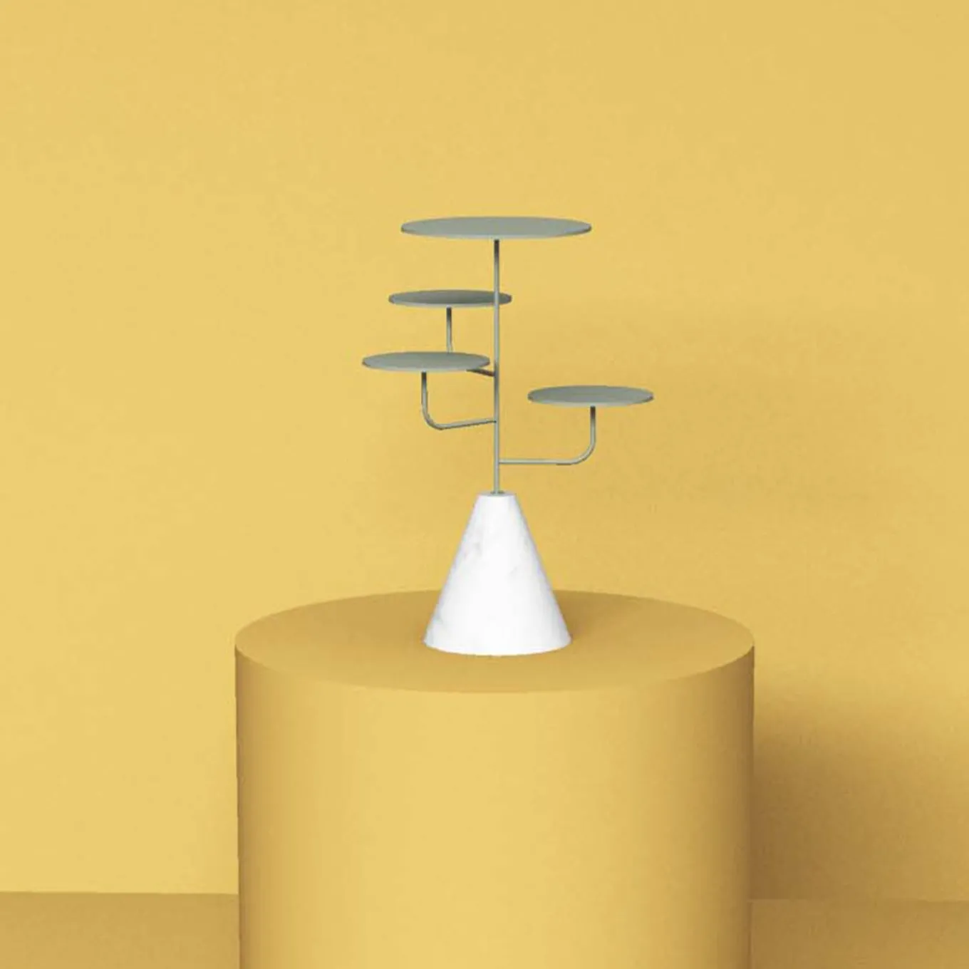 This exclusive four-tier serving stand in sage-green-lacquered iron is an actualization of the concept of sharing, which happens to be favored by food as a cultural factor. Four round tops sustained by the same number of arms gracefully extend in a branched-out silhouette resting on a conical base crafted of white Carrara marble. The design comes in other color and marble options, please ask the Concierge for details.