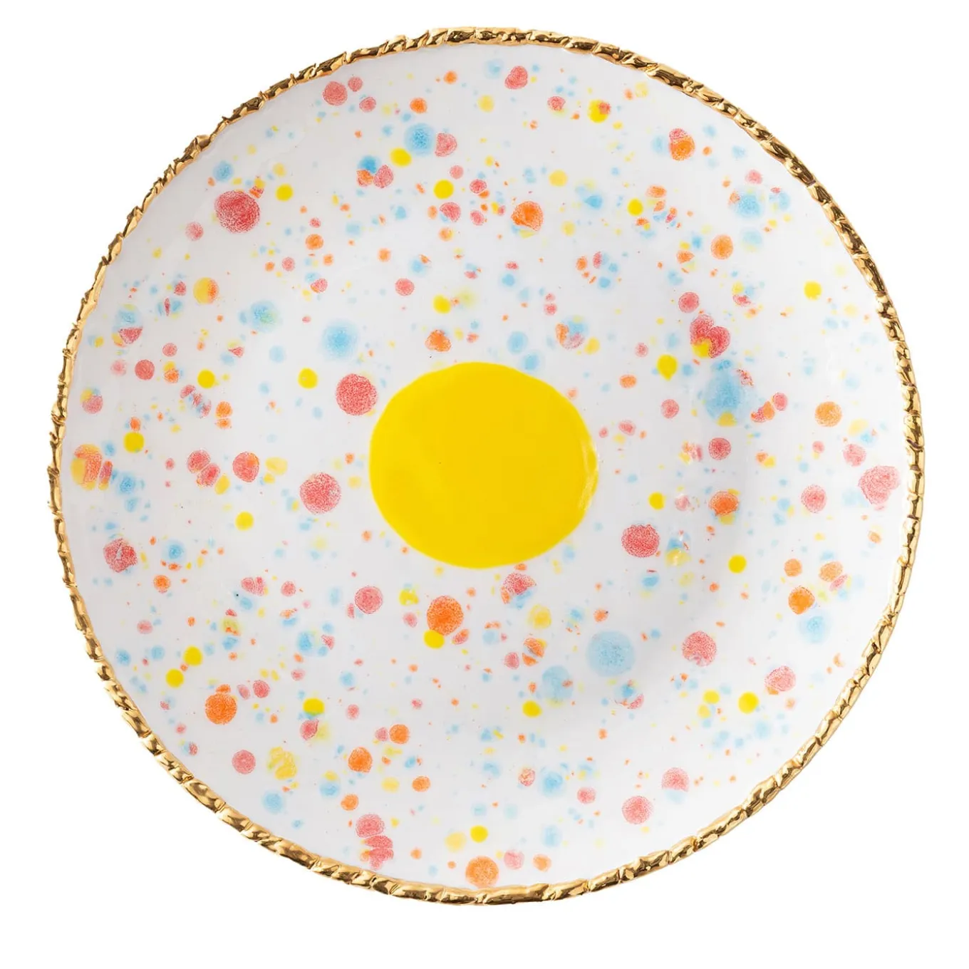 An ode to the endless artistic potential of colors paired with traditional crafting techniques, this set of two dessert plates in fine porcelain is perfect for elegantly serving birthday cake slices to guests. The pattern of multicolor dots freely hand-painted embraces the central circle in solid yellow while the crackled rim accented with 24K gold leaf seals its unrepeatable design. Not suitable for microwave use.