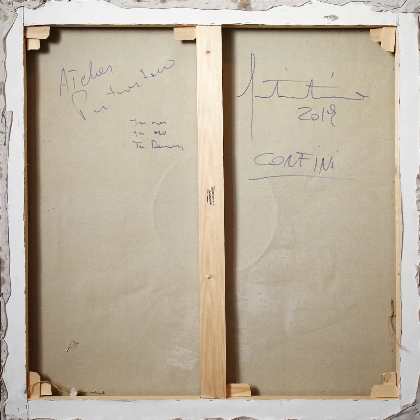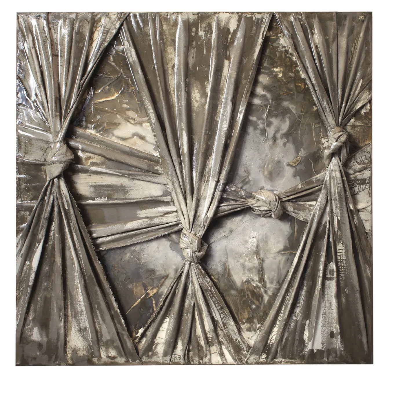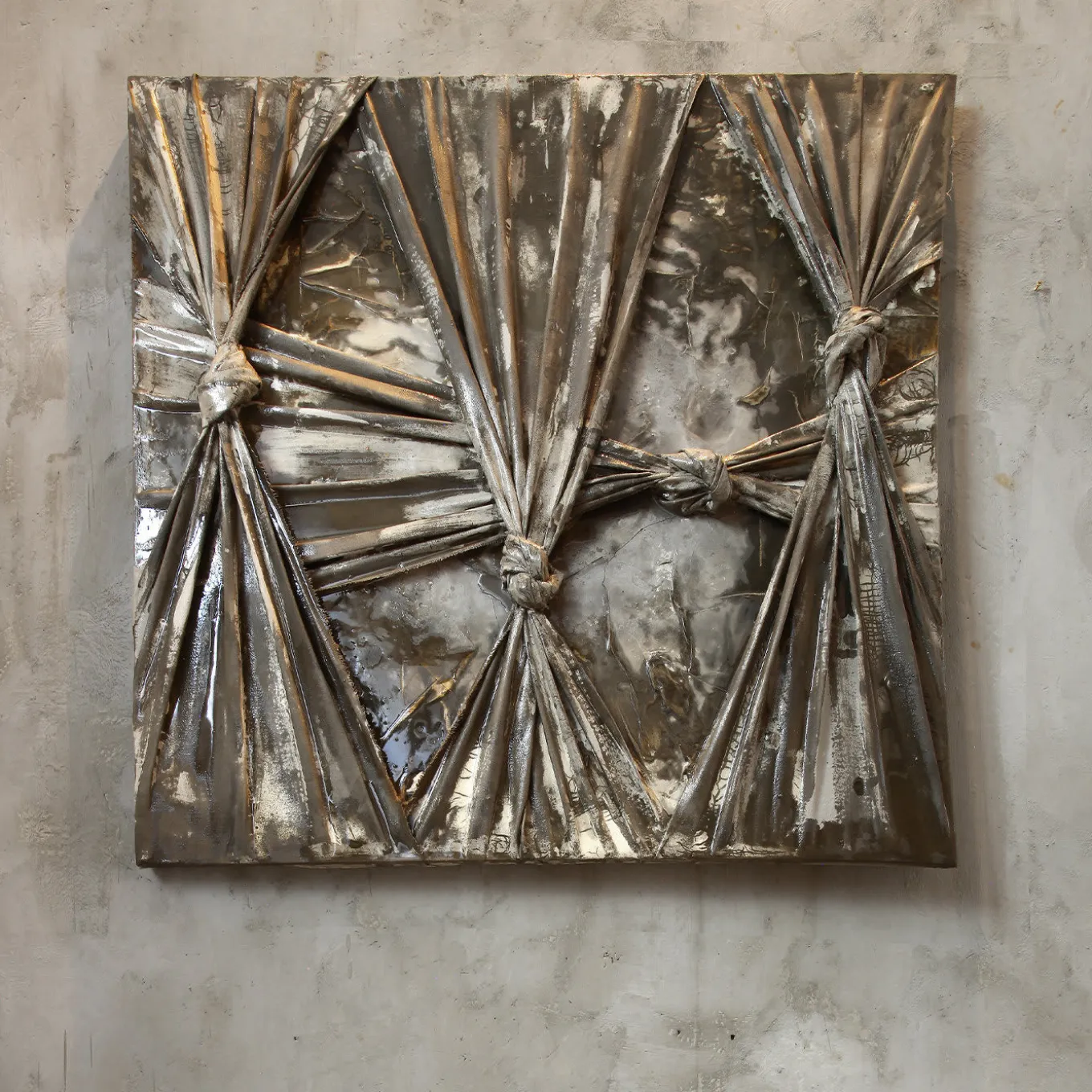 A singular interpretation of the concept of “borders” (“confini” in Italian), this mixed media is composed of fabric knotted on resinated cement. Enhanced with a brown hue, the striking shapes created by the knots exude a sense of suffocation and restriction. This piece is inspired by artist Fabio Pietrantonio’s many travels around the world and his connection to indigenous communities.