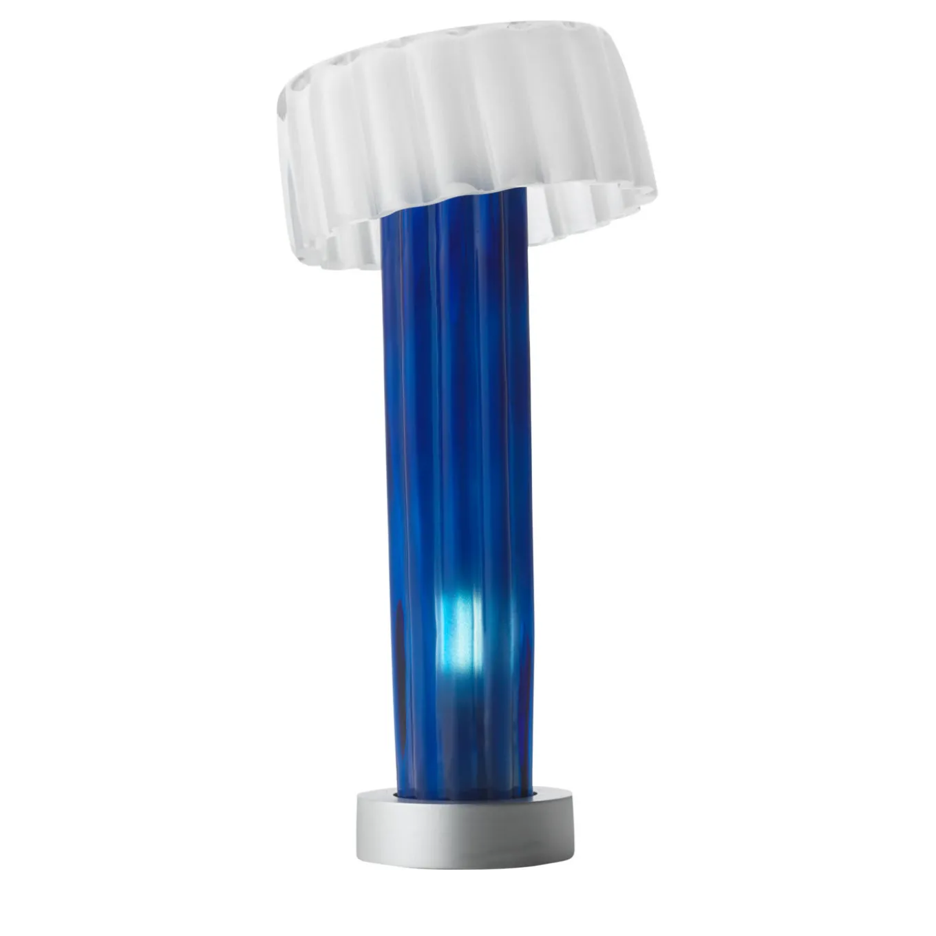 This exclusive table lamp boasts an innovative and playful design that lends it a distinctively contemporary allure. The round metal base is covered with prized silver leaf and supports the grooved, cylindrical lampshade in blue glass hosting the E14 tubular LED light (4W). An open, cylindrical shade in matte white glass leans on the blue diffuser for a captivating visual effect. Dimmable on request.