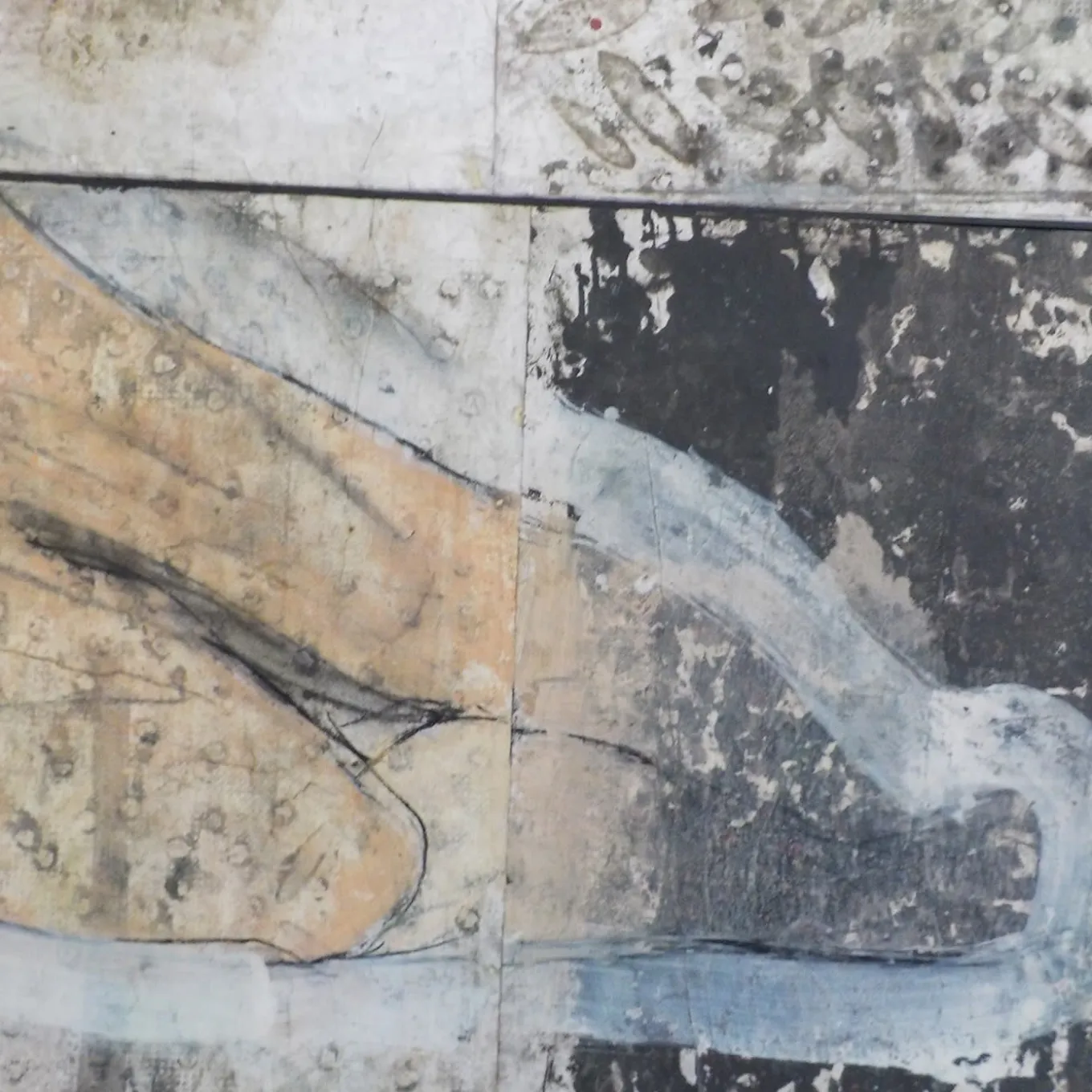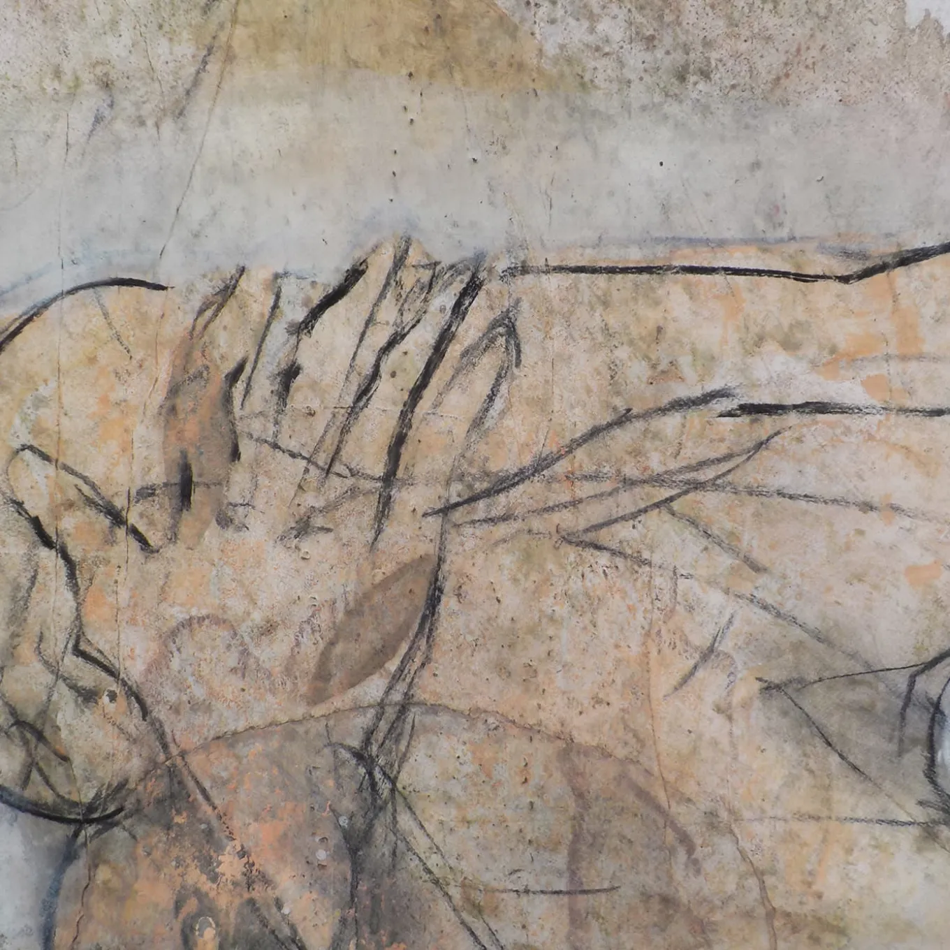 A splendid large-format artwork from an exclusive series that reinterprets Renaissance and Baroque artists with a contemporary flair, this painting depicts details from Caravaggio’s ‘Conversion of St. Paul’. Created on paper using alcohol colors and pigments, showcasing traces of charcoal drawing, the lines and patterns are made with the use of an intaglio press and firing technique, the artist’s signature style.