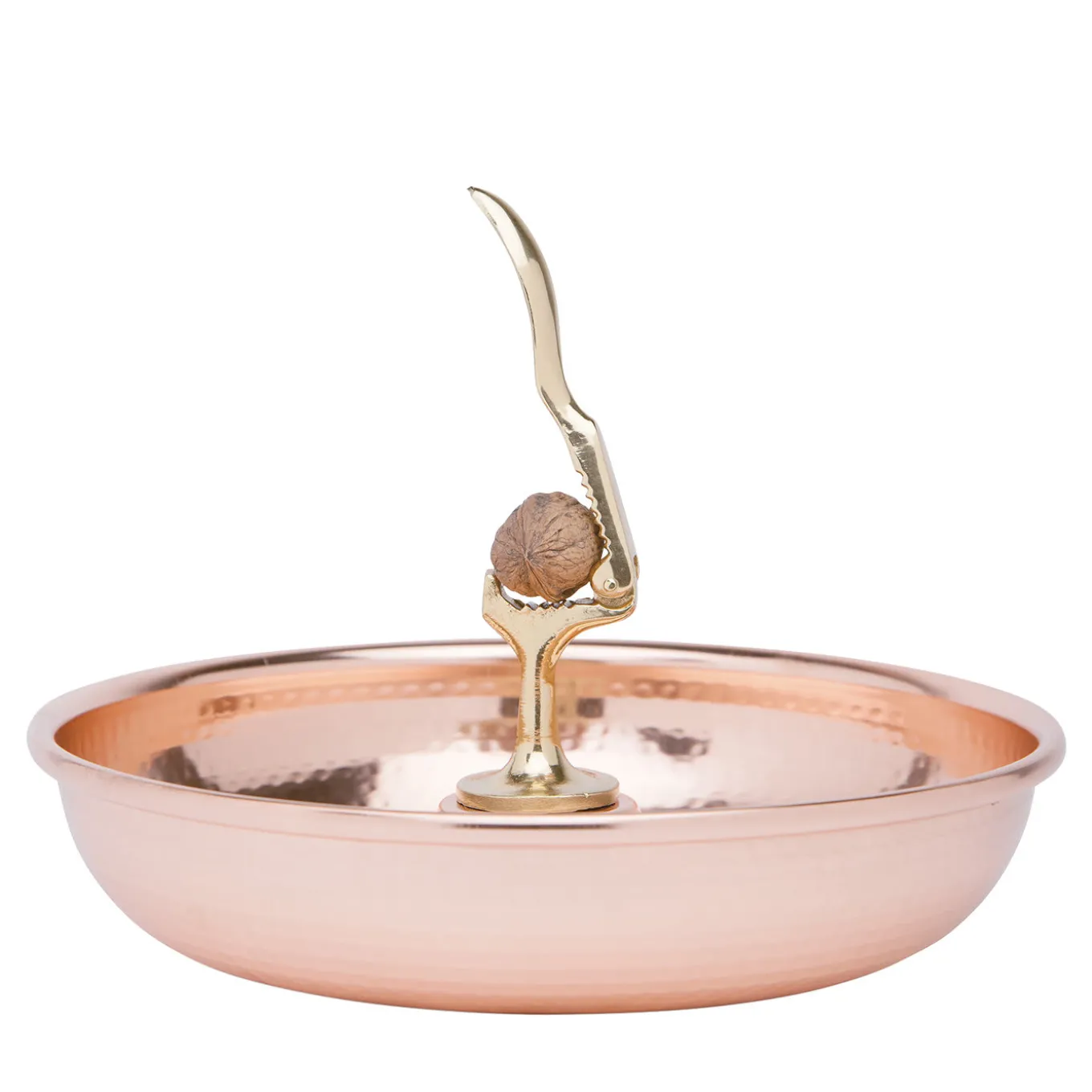 This nutcracker embodies the perfect harmony between functional and refined design. Superbly crafted of solid hand-hammered copper enriched with solid brass details, it is composed of a built-in nutcracker mounted at the center of a shallow bowl. This original piece brings back the undeniable charm of the old-fashioned way of serving shelled nuts during the holidays, sitting around the table conversing and drinking warm cider. Products may have imperfections given by craftsmanship.