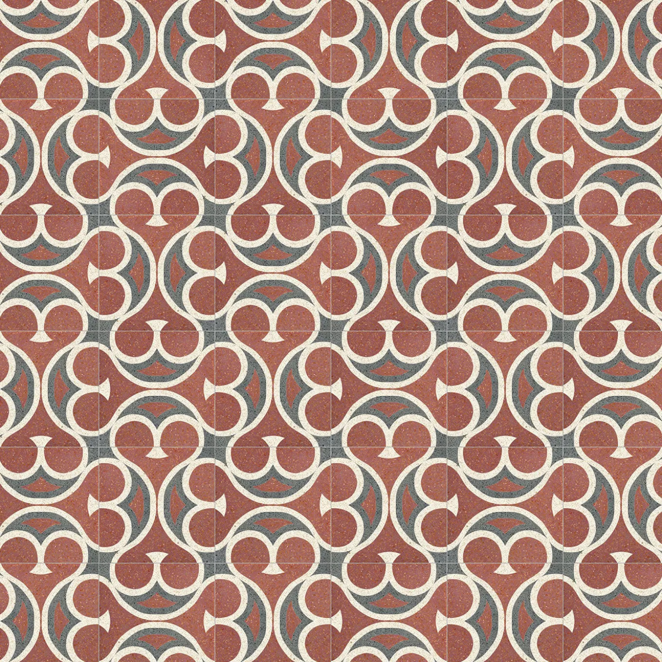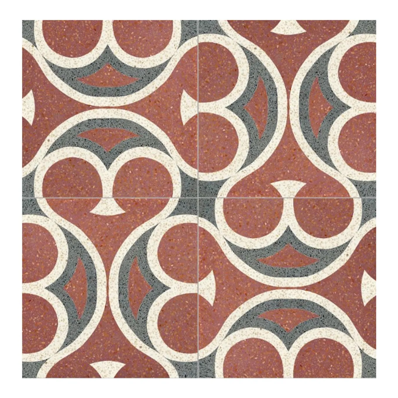 A striking focal point for modern interiors, these magnificent terrazzo tiles feature a contemporary pattern of curved forms in red, pearl white, and gray. Each tile is masterfully handcrafted and hand-decorated by the expert artisans of Romano’s workshop in Sicily, using traditional techniques and a refined blend of natural raw materials—including cement, marble chips, and volcanic sand from Mount Etna. Tiles are sold by the square meter, with each square meter including 16 tiles.