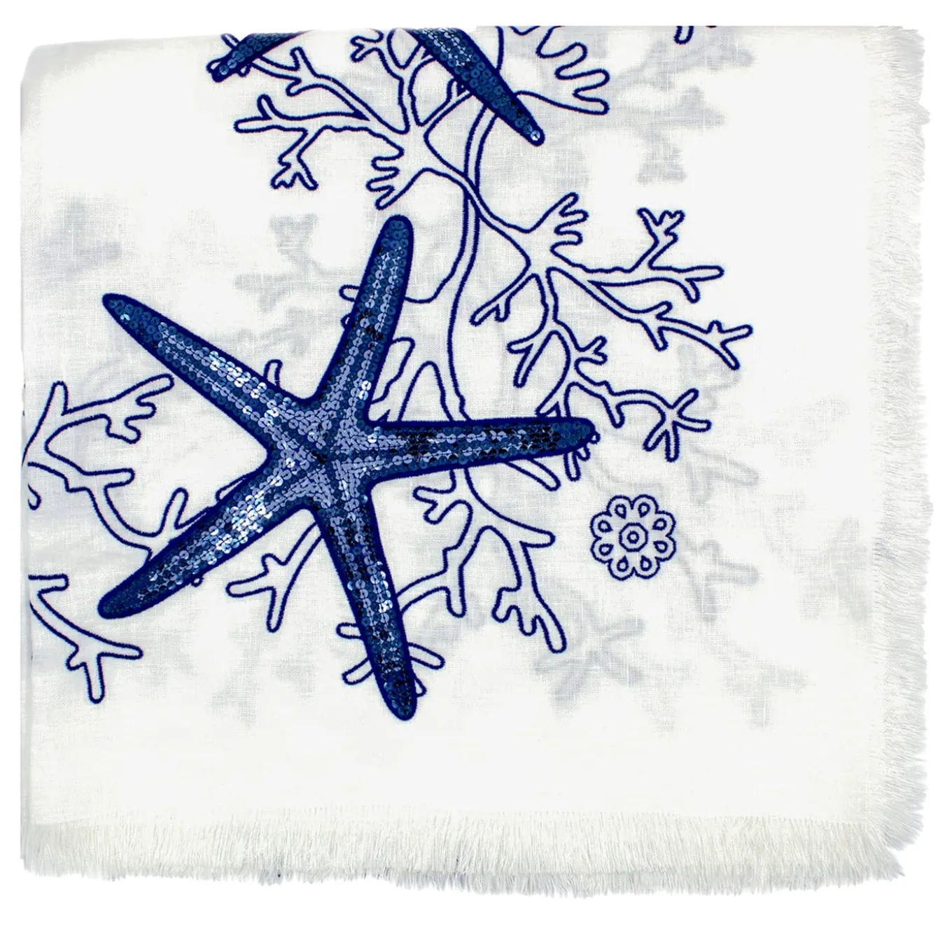Fresh and sophisticated, this precious Masters of Linen-certified white linen tablecloth strikes with its intricate embroideries of corals and starfish evocative of breath-taking underwater scenarios. Multiple hours of manual embroidering are behind its one-off look, sealed by fringed profiles and further embellished with color-coordinated spangles. More colors are available in the Artemest catalog.