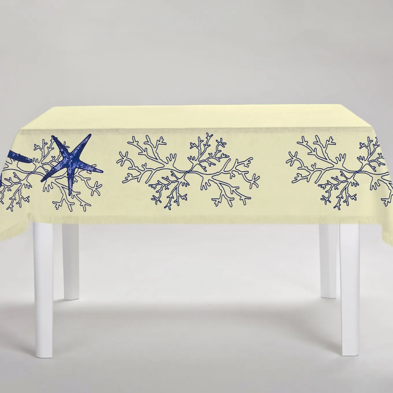 Several hours of meticulous manual work led to the stunning blue Mako cotton embroideries of corals and starfish adorning this one-off tablecloth. Sewn from Masters of Linen-certified yellow linen and enlivened by fringed profiles, it will be ideally unfurled on tables of refined coastal homes. Blue spangles further embellish the tablecloth, completing the piece. More colors are available in the Artemest catalog.