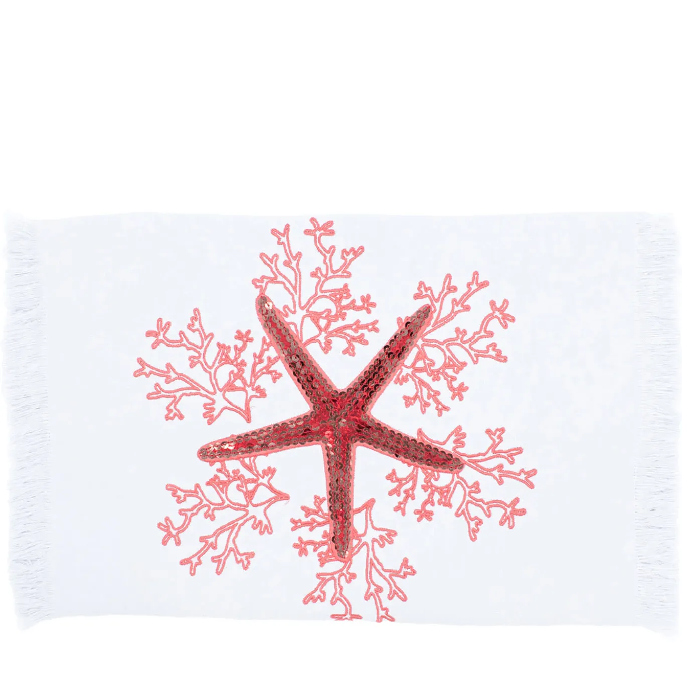 Embellished with delicate applications of spangles, pink Mako cotton embroideries of corals and starfish adorn this refined runner. Sewn from precious Masters of Linen certified white linen, it gets minutely hand-embroidered and completed by lively fringed borders. Different color options are available in the Artemest catalog.