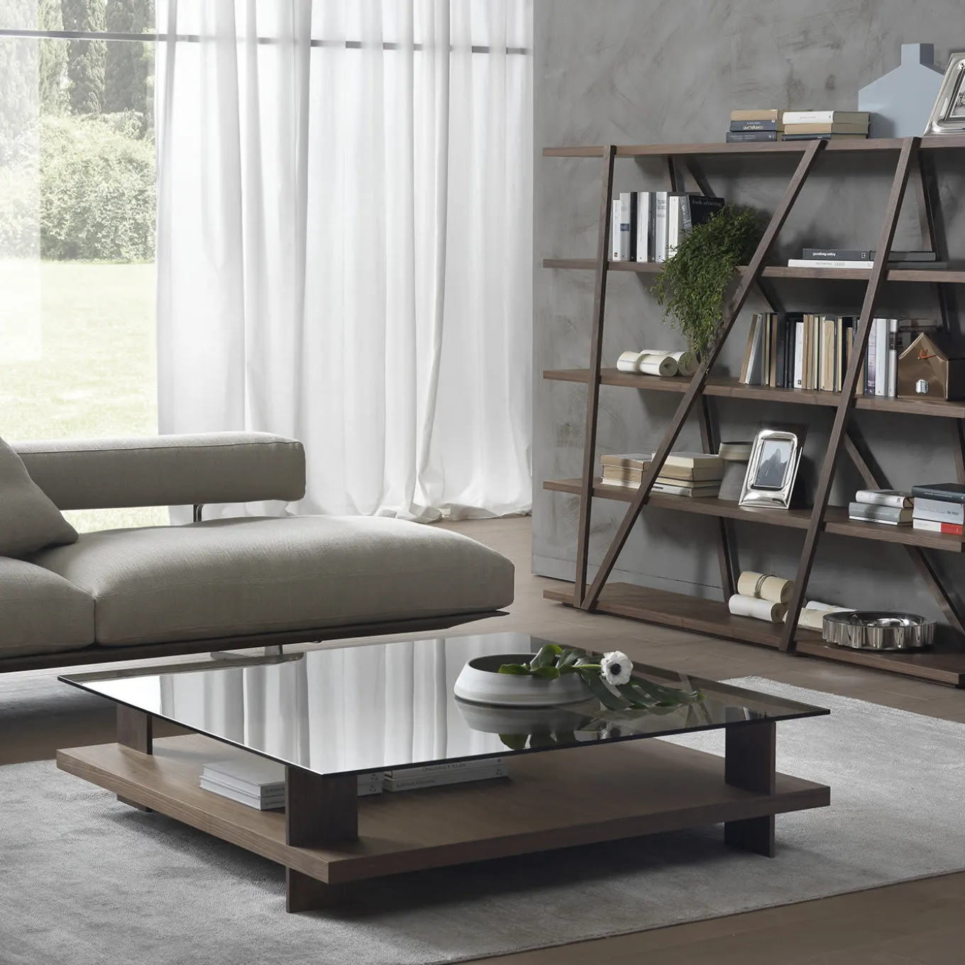 Part of the Corallo collection, this square coffee table is both functional (because it provides two visible display surfaces) and decorative (thanks to its solid yet harmonious silhouette and the use of natural materials). The upper top is in transparent-bronzed glass and is supported by a wooden structure with a Canaletto walnut veneer that comprises a lower top pierced by the four vertical legs. The aluminum details also boast a Canaletto walnut veneer. This piece is also available with clear glass top and wenge or black stained finish, please inquire with the Concierge.