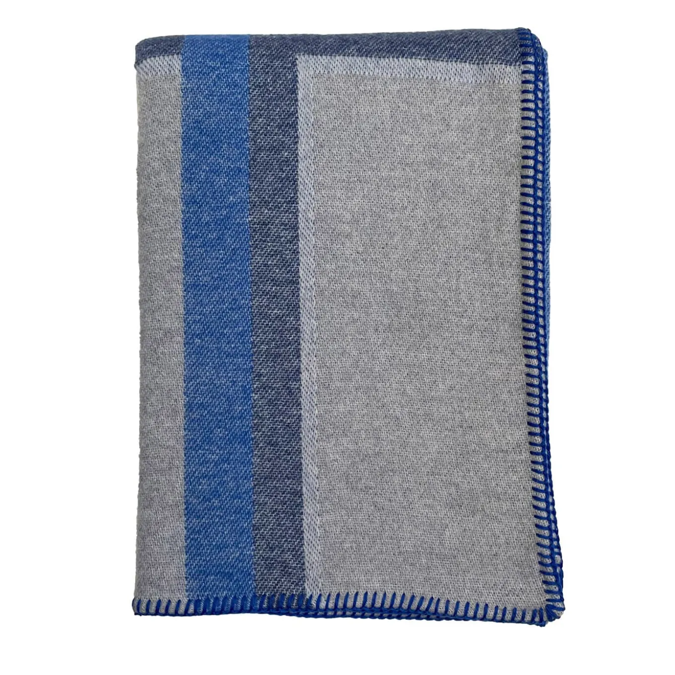 Painstakingly woven from 100% Merino wool, this jacquard blanket belongs to the sophisticated series of designs with hems decorated with blanket stitchings. Blue-tined stripes create a refreshing chromatic contrast with the gray-hued background, for a color scheme of unfailing class. A version with green and yellow stripes is available. Dry cleaning is highly suggested.