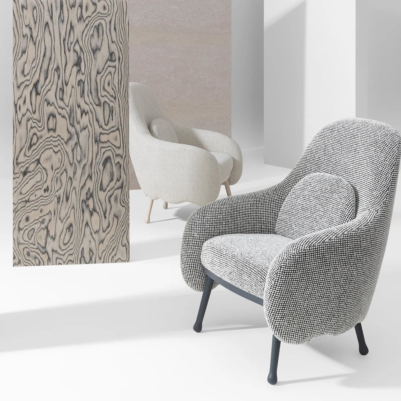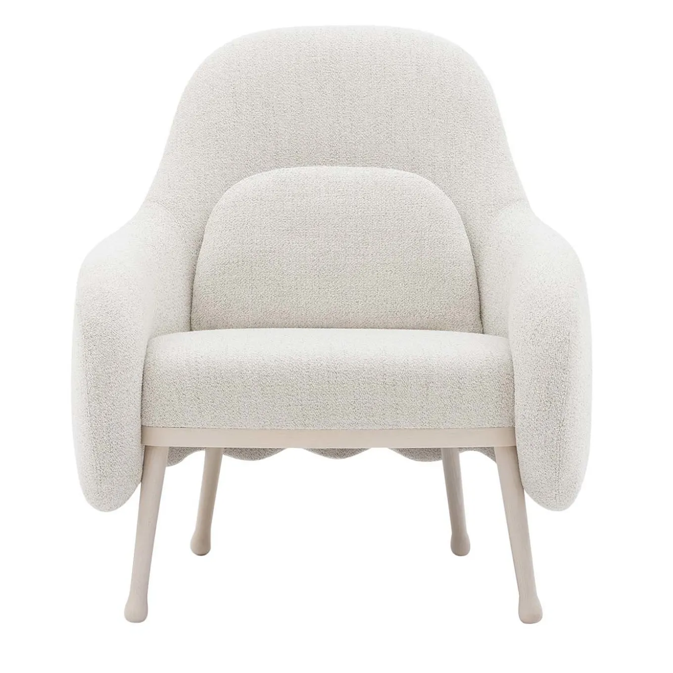 A low profile and a soft, welcoming seat are distinctive features of this splendid armchair by Cristina Celestino. Boasting a contemporary flair, it rests on four ashwood legs enriched with round feet and felt pads, and it features a tall back waved at the bottom and sinuously merging with the armrests on the sides. Softly padded, the seat is upholstered of textured white fabric. This piece is currently on show and immediately available at Artemest Galleria New York.