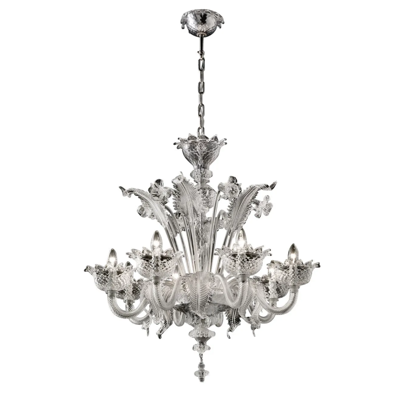This magnificent chandelier in Murano glass features six lights elegantly adorned with an array of fine flowers and leaves, reproducing a traditional model from the 19th century. The metal accents can be in galvanized gold or in polished chrome.