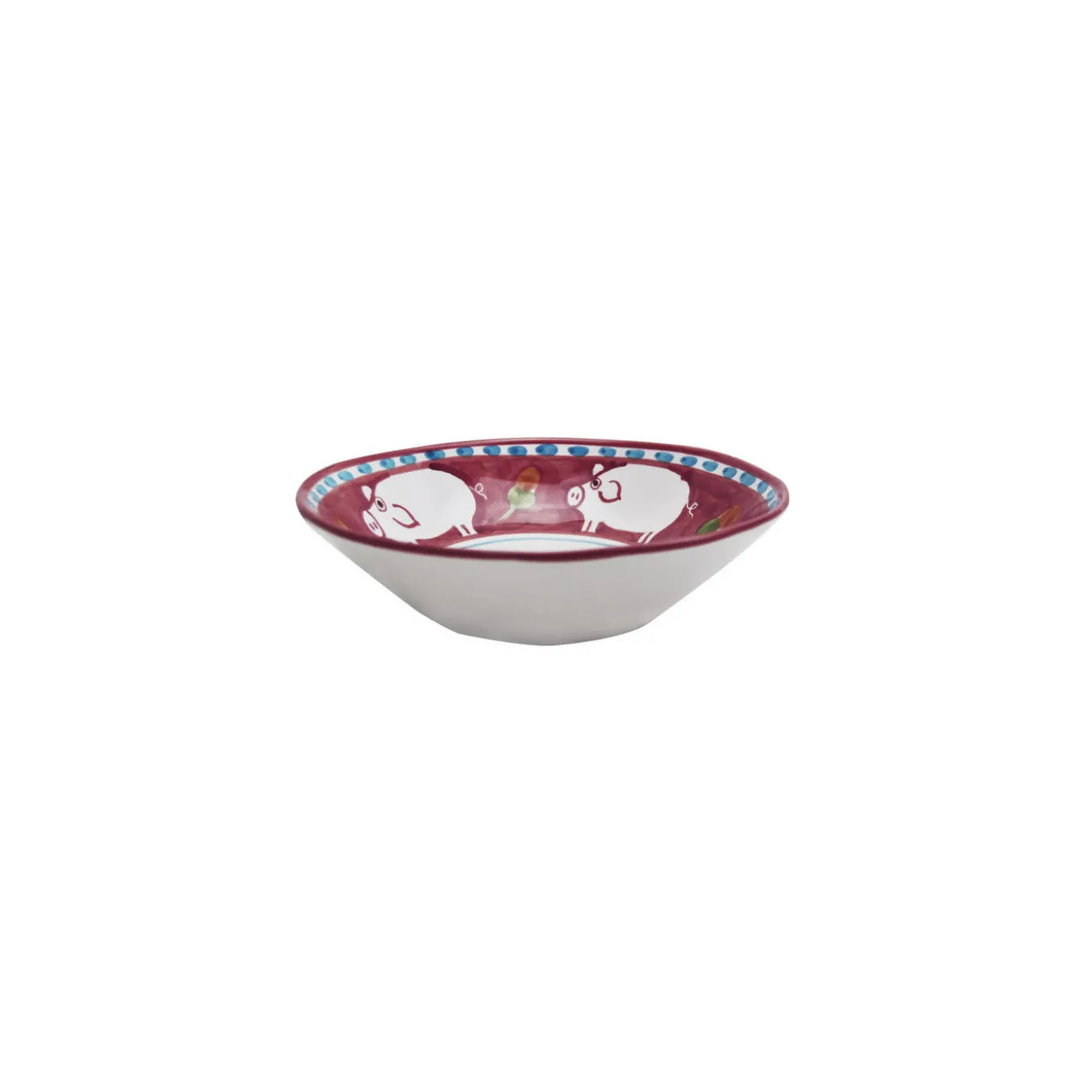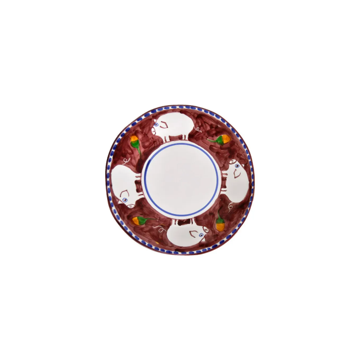 Fashioned of fine ceramic, this captivating set conveying rural visual aesthetic comprises six dinner plates (⌀ 29 cm), six soup plates (⌀ 23 cm), and six dessert plates (⌀ 23 cm). Each plate is painted on the inside in a sequence of white pigs and two-tone ocher and green flower buds on a plum-colored background. The dashed blue band gracing the plates’ upper rim matches the inner circular line defining their central section.