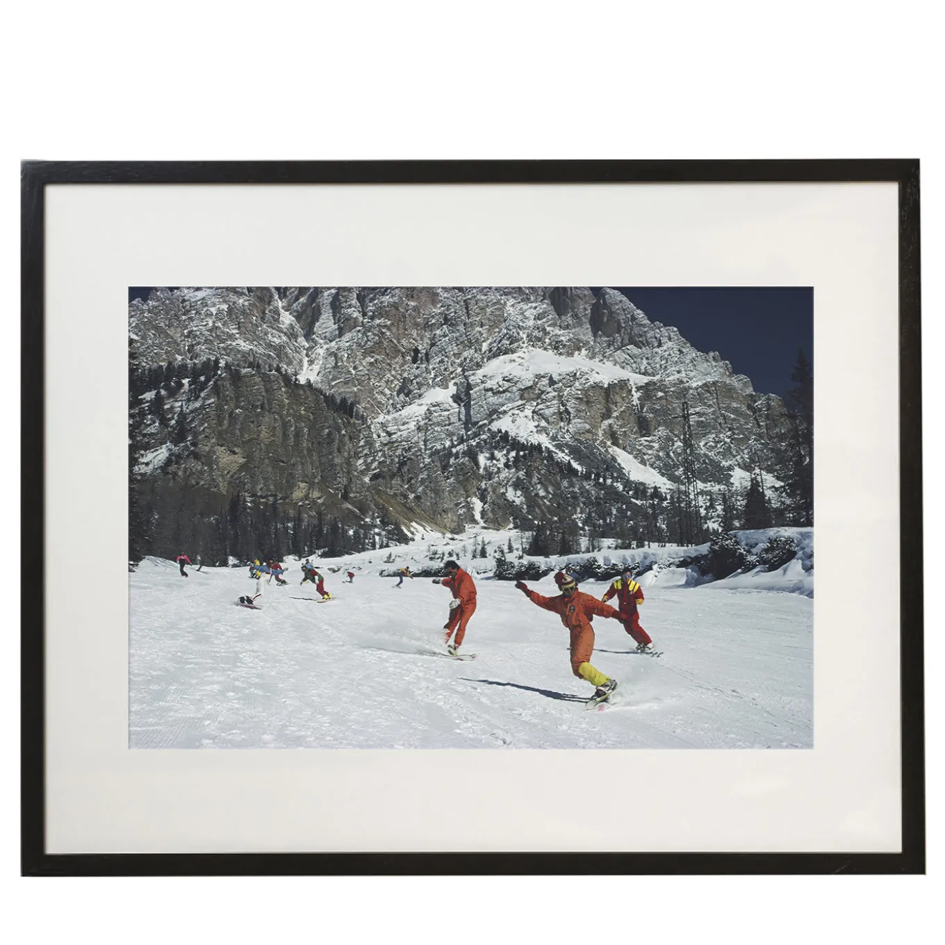 Lively and dynamic, this C-type photographic print captures the fast-paced moment of a group of snowboarders descending a ski track of Cortina d’Ampezzo in the Dolomites mountain range. Distinguished by vivid colors, it is framed and available in other dimensions upon request, please ask the Concierge for details. Accompanied by certificate of authenticity.