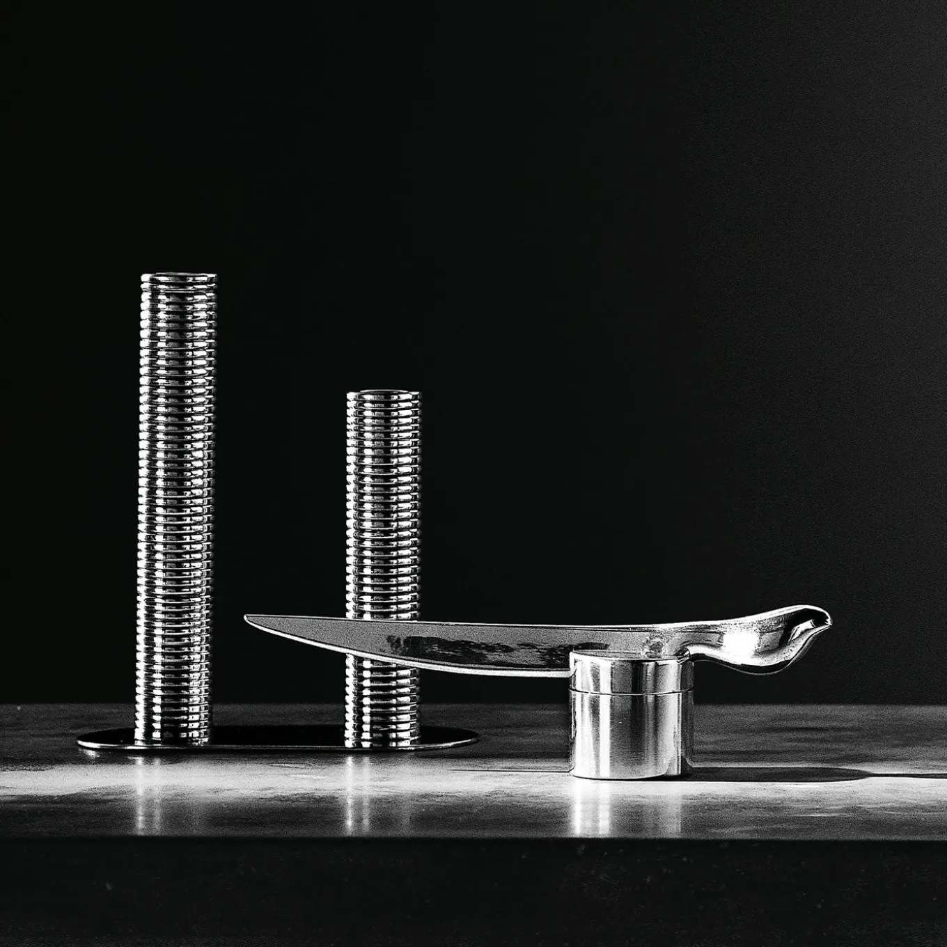 A detailed study of textures is the distinctive feature of this stunning candleholder designed by Marco Susani and Mario Trimarchi for the limited edition Metallia Project. Crafted of metal, this piece is composed of two cylindrical candlesticks whose circumference is marked by a regular series of grooves, contrasted to the smooth oval base sustaining the sticks.