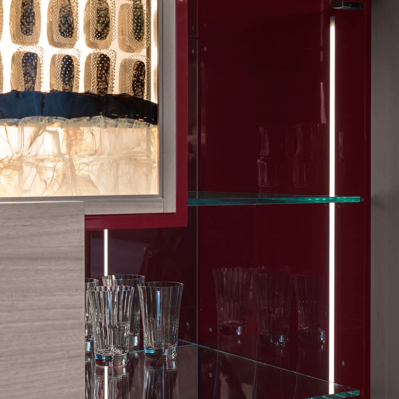 A priceless piece enriched by glass inserts backlit by LED light, this cabinet makes for a superb addition to luxurious modern decors. Wavy bronze handles perfectly harmonize with the grooved wooden feet, which showcase a warm and precious bronzed tone. The doors open to reveal plenty of storage space, with glass shelves, a mirrored bottom, and glossy-lacquered sides.
