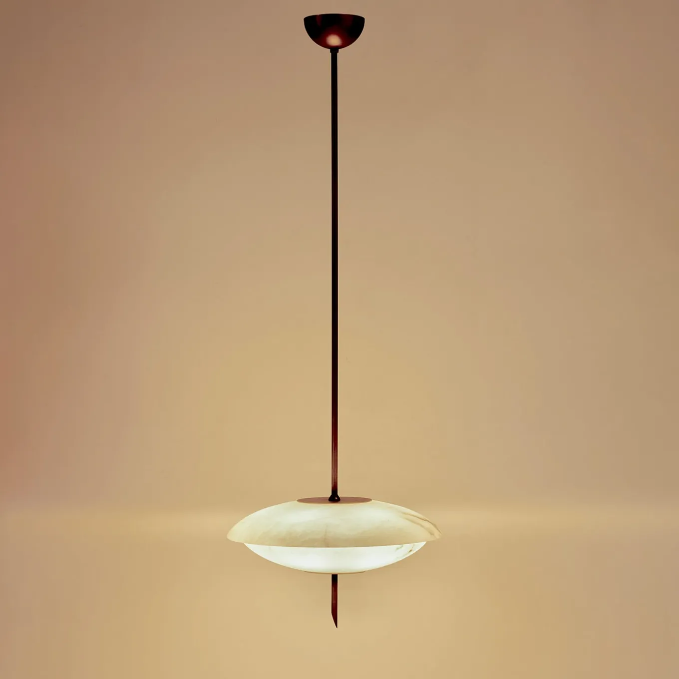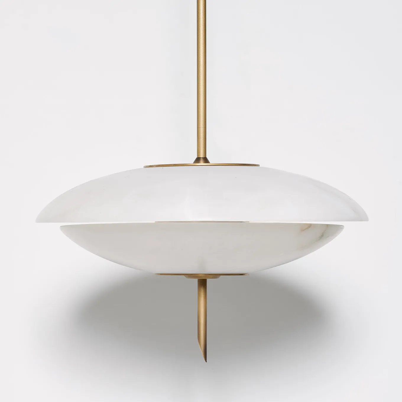 The Cosmos Chandelier is inspired by the sleek design aesthetics of the 1950s, embodying the pioneering spirit of the Space Age. Its convex alabaster plates softly diffuse warm light, creating an inviting atmosphere in any space. The brushed brass structure adds warmth and sophistication, enhancing the alabaster’s natural beauty. A standout feature is the unique “salami slice” cut brass finial, which adds character and elegance.