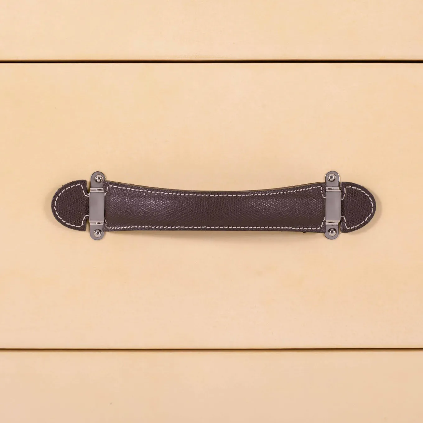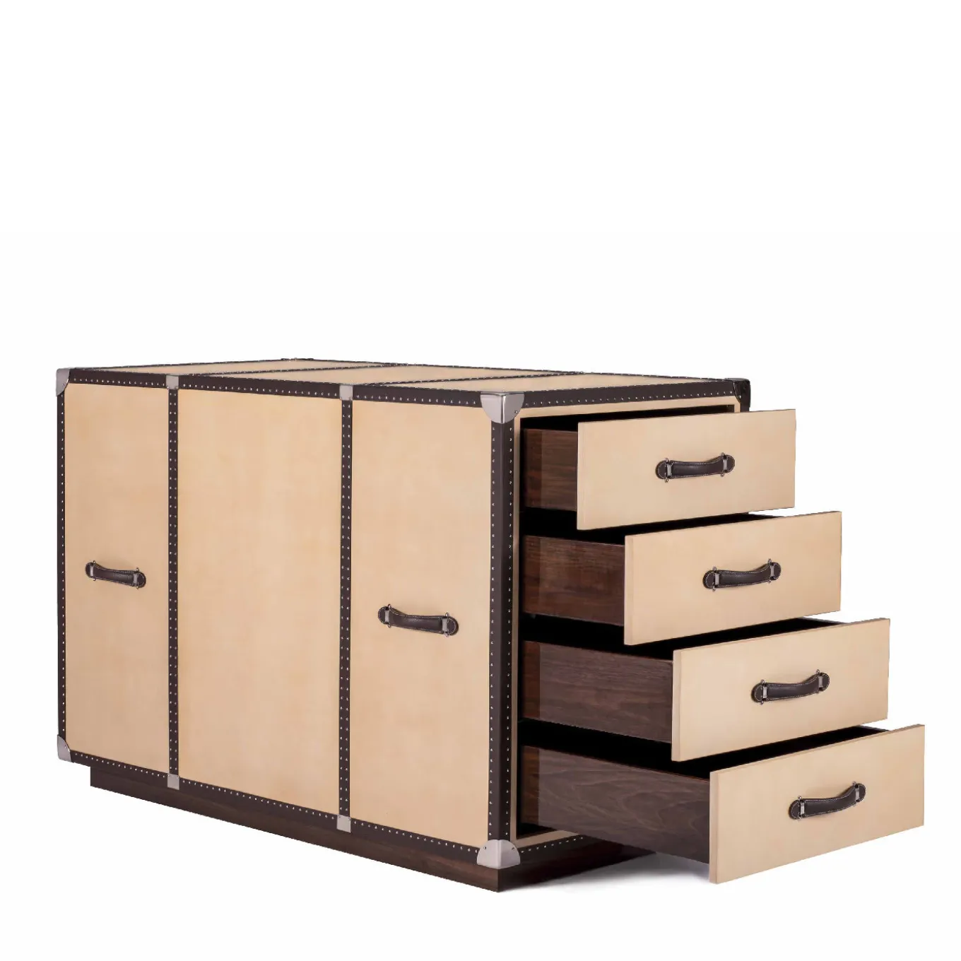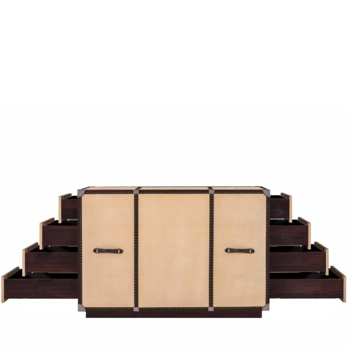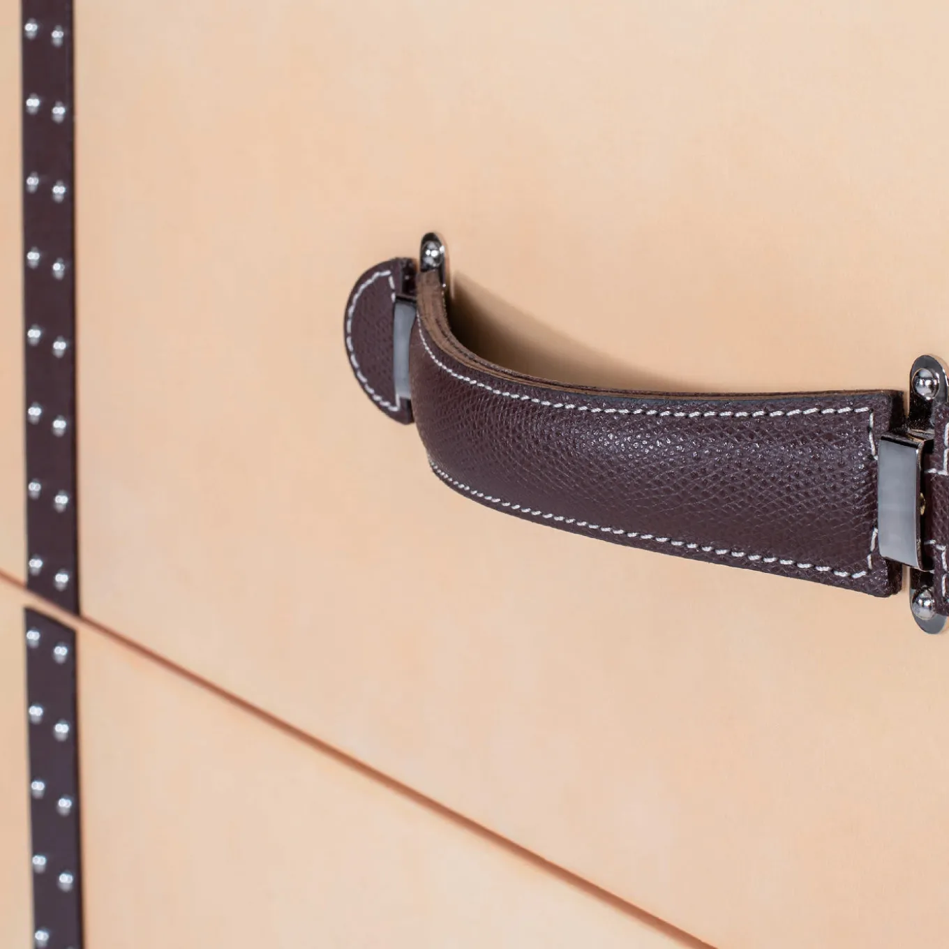 This exquisite trunk evokes the design of the roaring twenties and can be displayed at the center of a room. The structure is in poplar wood with wheels at the base for easy mobility and the exterior is covered in leather. The interior contains eight drawers featuring “blumotion” shock absorption system, in Italian walnut wood with a polished finish (a microfiber lining can be added). All the handles are in full brass with gold and nichel finish.