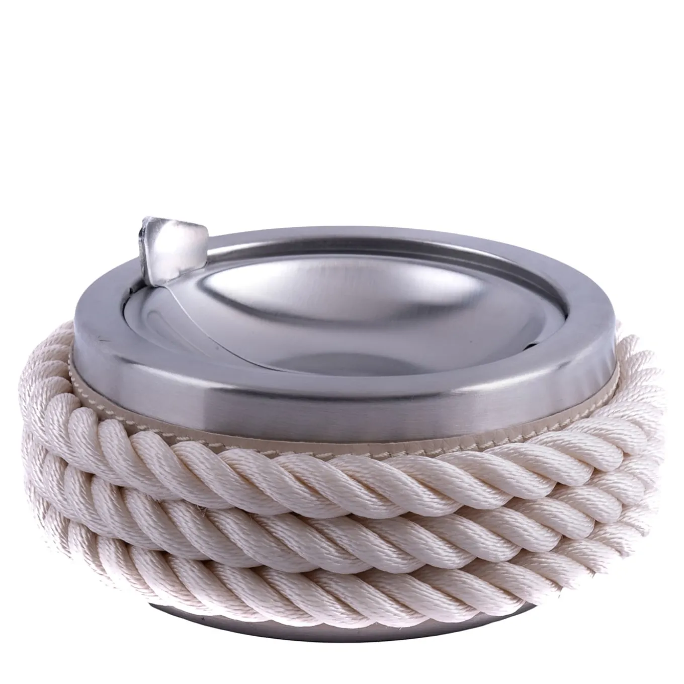 Showcasing a sleek look, this ashtray exudes understated sophistication in its clean and simple design. Handcrafted of steel, it is partly upholstered with cream-colored faux leather adorned with nautical rope. It features a concave top and it is wind-resistant. Available in a wide range of colors, please consult the Artemest catalog or contact the Concierge for further details and options.