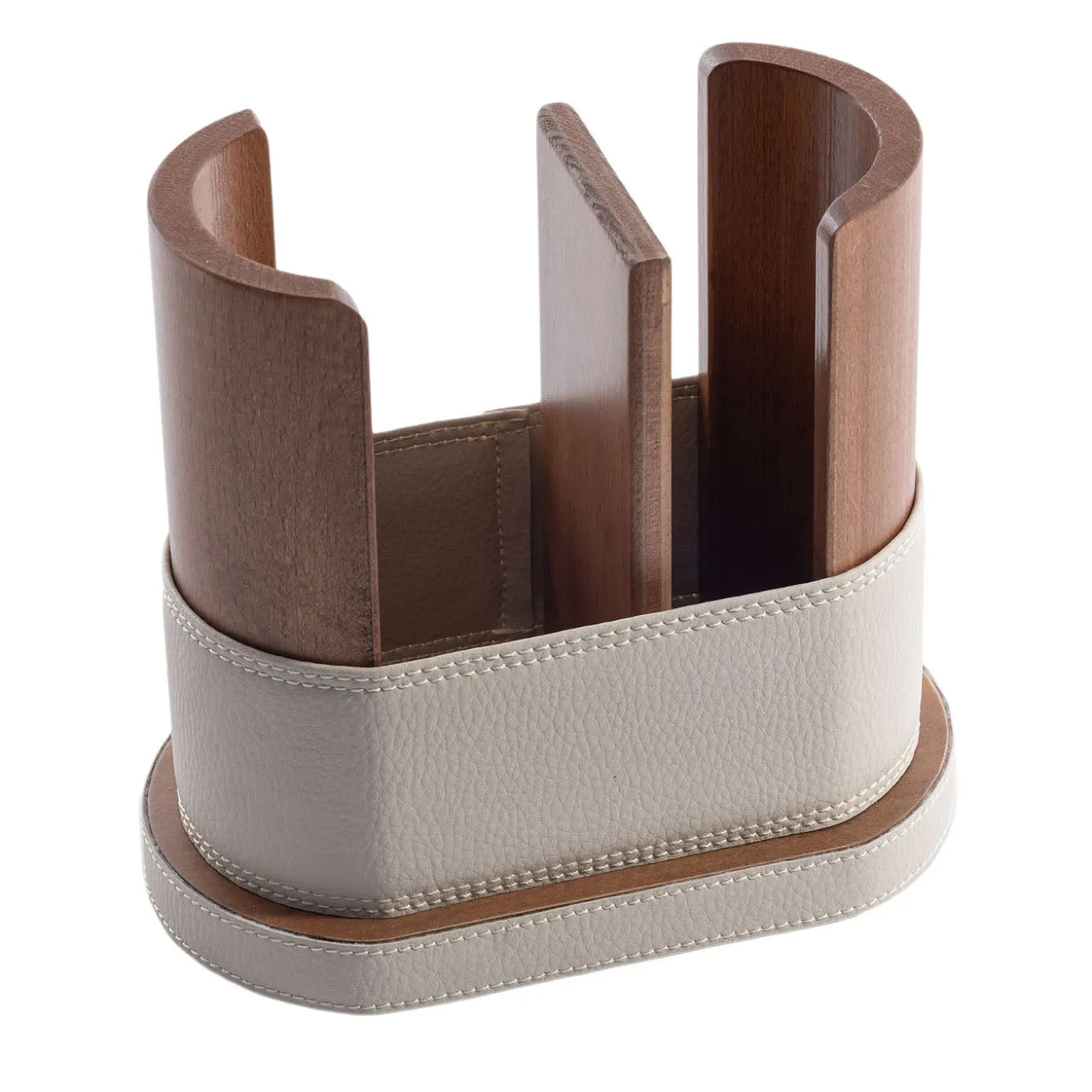 Chromatic and material contrasts characterize this solo cup holder, ordinary design gaining unexpected exclusivity thanks to its elegant cream faux-leather inserts. Crafted of wood, the resistant structure consists of curved sides and a central divider that can be easily repositioned to accommodate different-sized cups. More color variants are available in the Artemest catalog.
