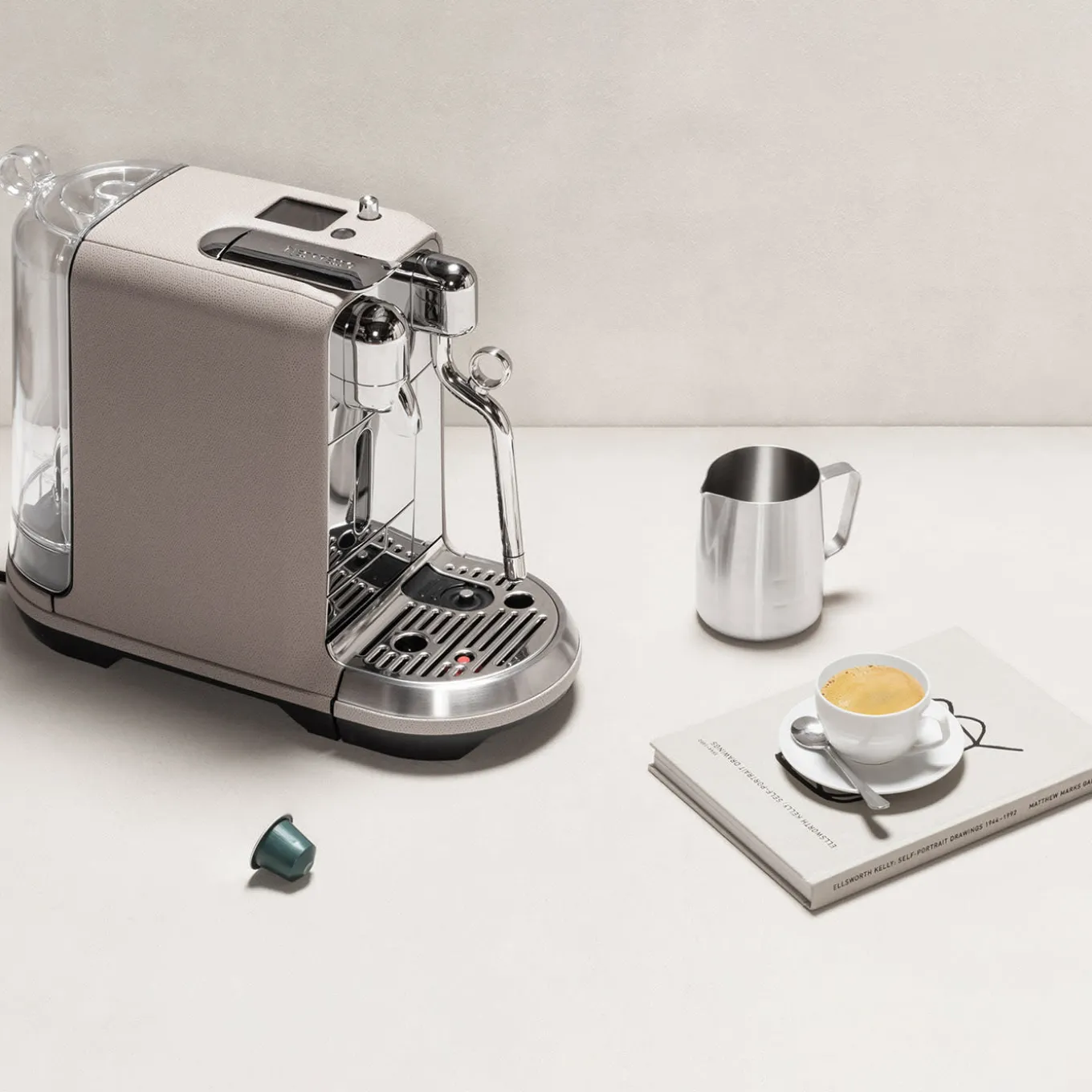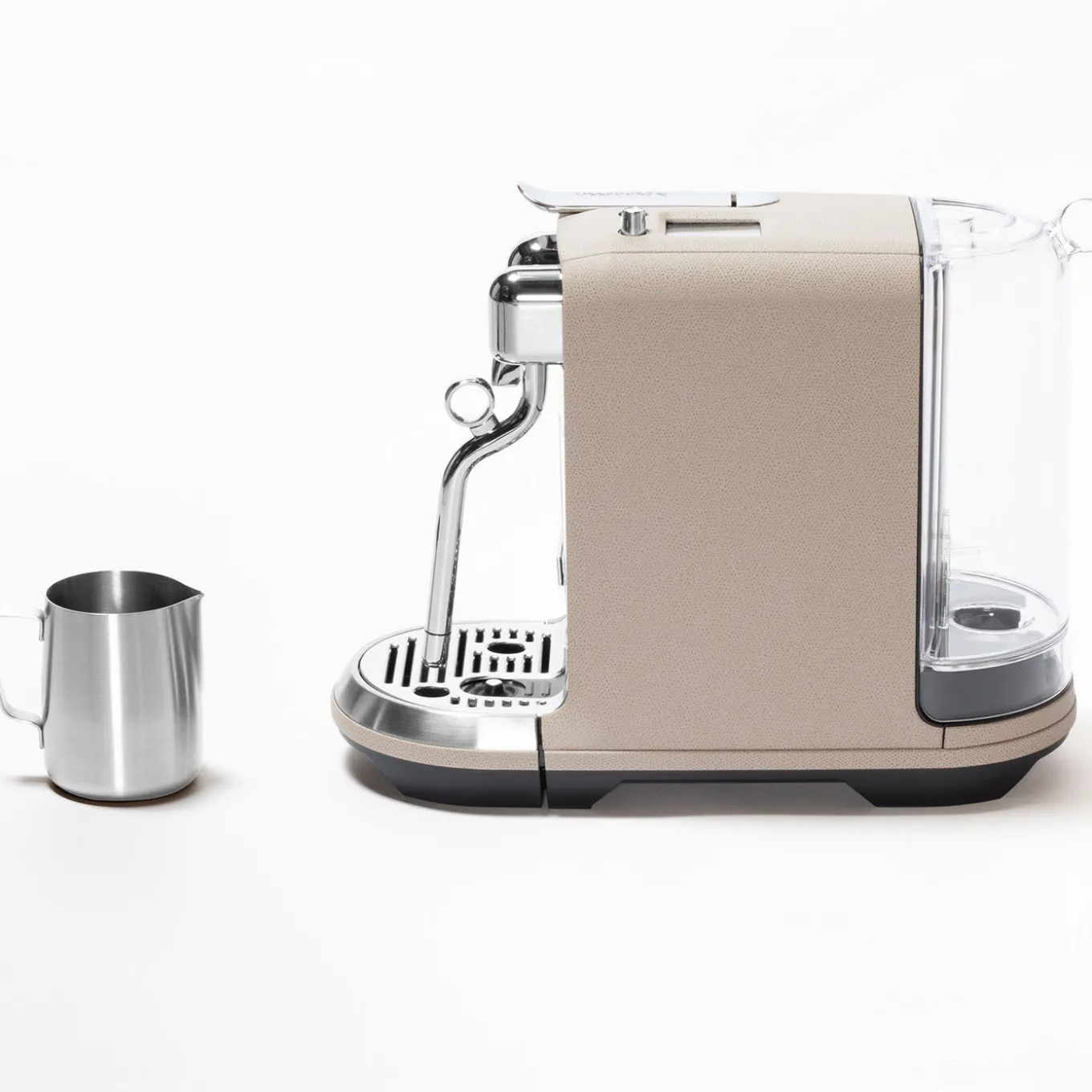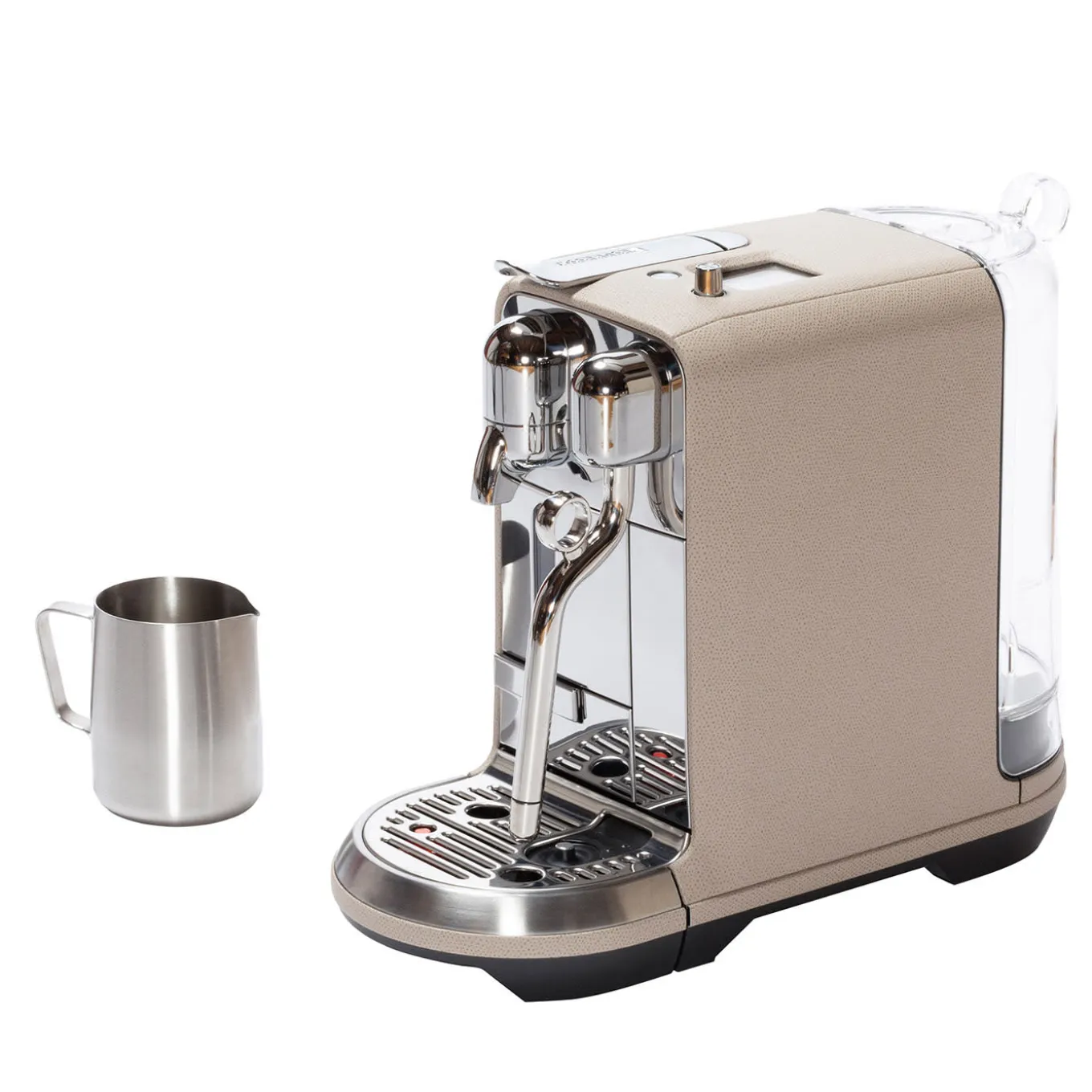 Leather-bound Nespresso machine. It uses classic Nespresso capsules and includes the possibility to pour just hot water. It boasts an array of different milk recipes thanks to its built-in milk frother and the interactive touch screen, which allows to customise settings at will to make one’s own signature coffee. It comes with a stainless steel milk jug. Voltage available: 110V (price available on request) or 220V.